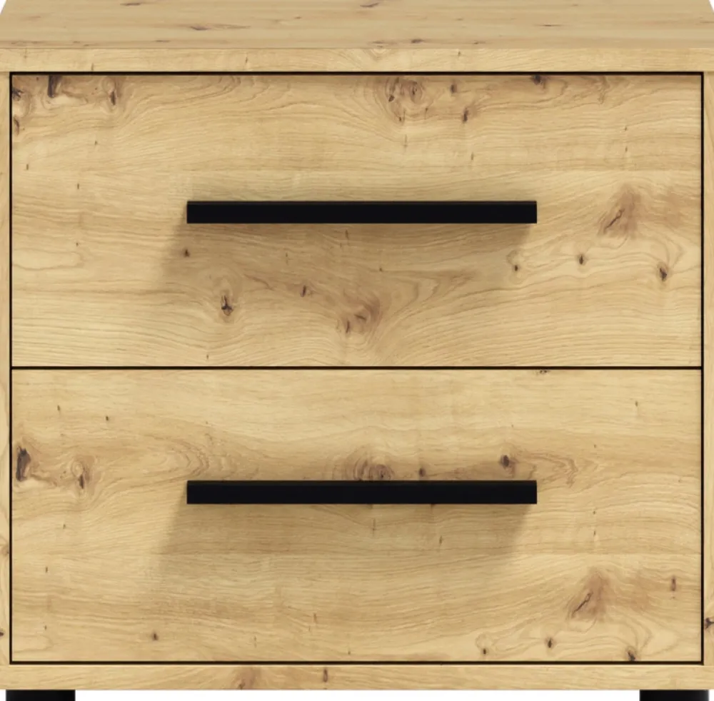 - Stolik nocny MAXIDO w dekorze dąb artisan z 2 szufladami na prowadnicach kulkowych to funkcjonalny mebel do sypialni. Kolor dębu, czarne uchwyty, stabilna konstrukcja i nogi z tworzywa. Idealny wybór do skandynawskich i klasycznych aranżacji.