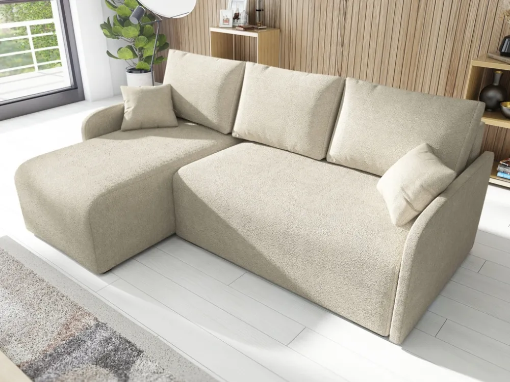 Narożnik wyposażony jest w pojemnik na pościel, który znajduje się pod siedziskiem. To niezwykle funkcjonalne rozwiązanie pozwala na wygodne przechowywanie kołder, poduszek i innych niezbędnych rzeczy, które w każdej chwili będą w zasięgu ręki. Dzięki temu łatwo utrzymasz porządek w salonie, bez potrzeby dodatkowych szafek czy komód.