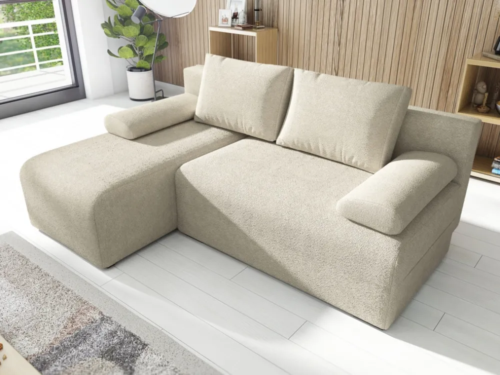 Narożnik boucle ERNEST idealnie wpisuje się w aktualne trendy wnętrzarskie. Z funkcją spania o powierzchni 138×200 cm, stanowi doskonałe rozwiązanie zarówno do codziennego wypoczynku, jak i okazjonalnych noclegów dla gości. Jego minimalistyczna forma, połączona z praktycznymi rozwiązaniami, sprawi, że Twój salon zyska nowoczesny wygląd, zachowując pełną funkcjonalność.