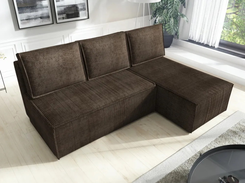 Tapicerka narożnika wykonana jest z wysokiej jakości tkaniny sztruksowej, która wyróżnia się swoją prążkowaną strukturą i miękkością. Sztruks dodaje meblowi niepowtarzalnego stylu, jednocześnie oferując trwałość i odporność na codzienne użytkowanie. Dzięki temu, narożnik nie tylko świetnie się prezentuje, ale także zapewnia długotrwały komfort i estetykę przez lata.