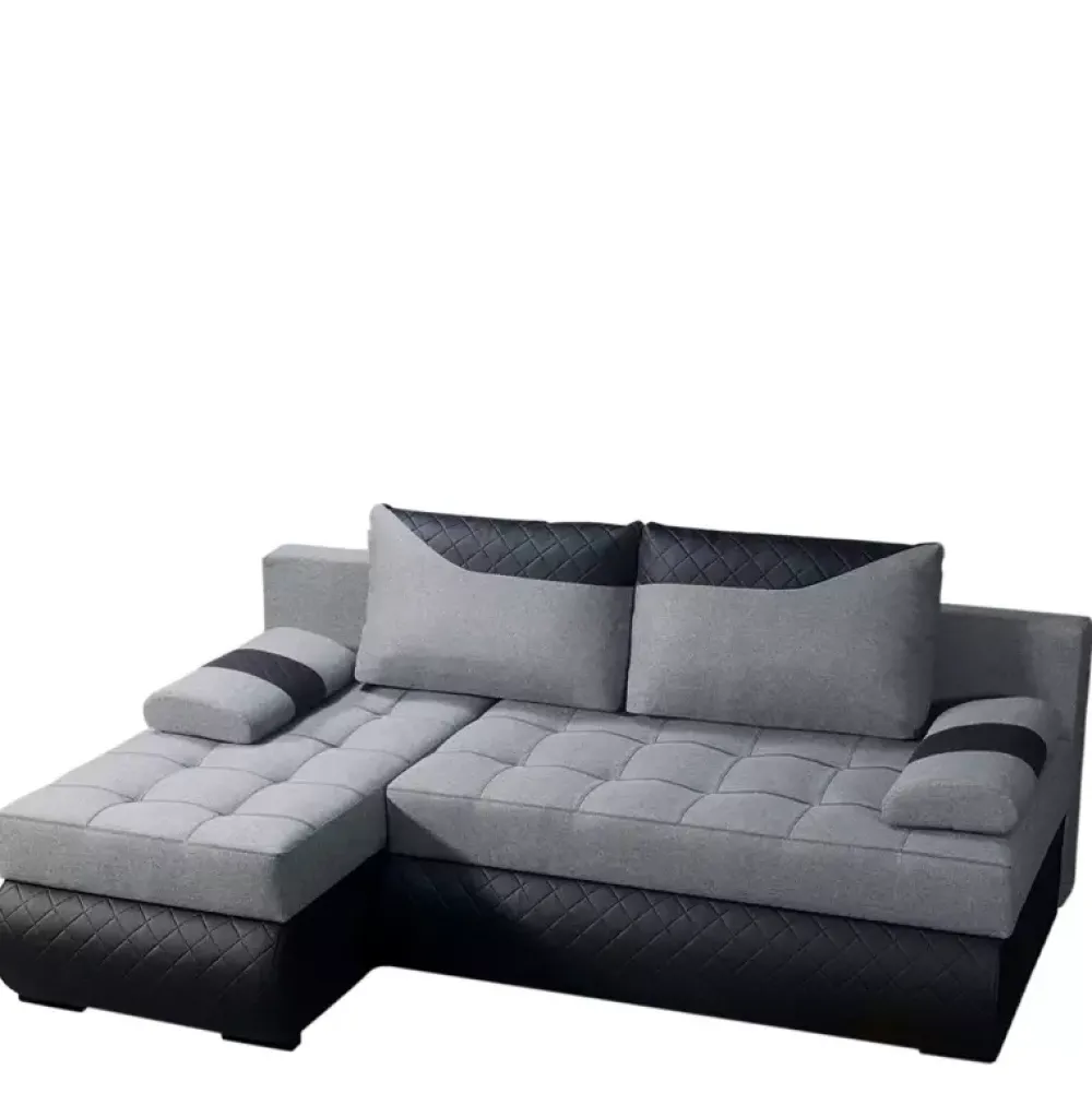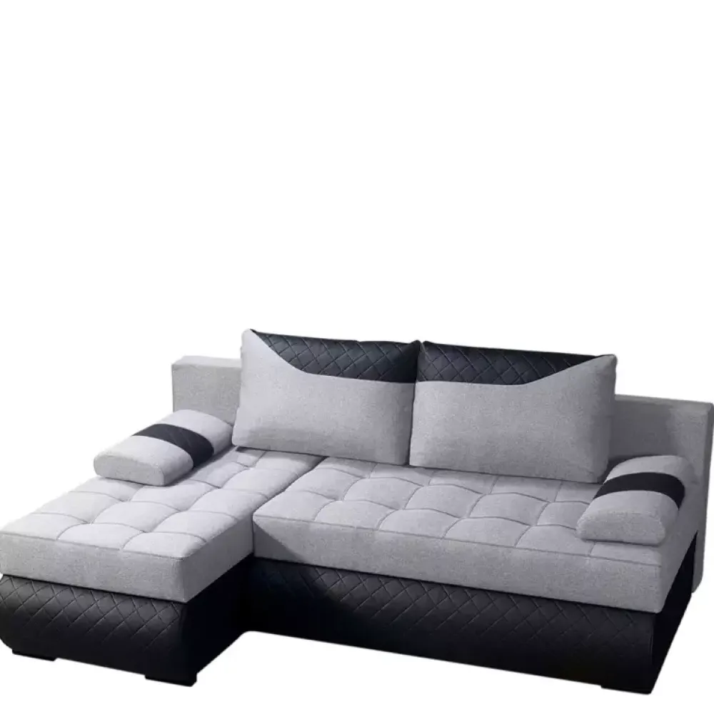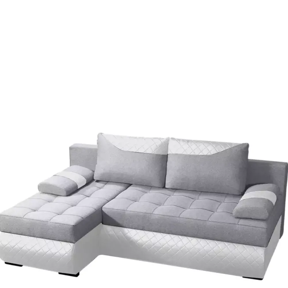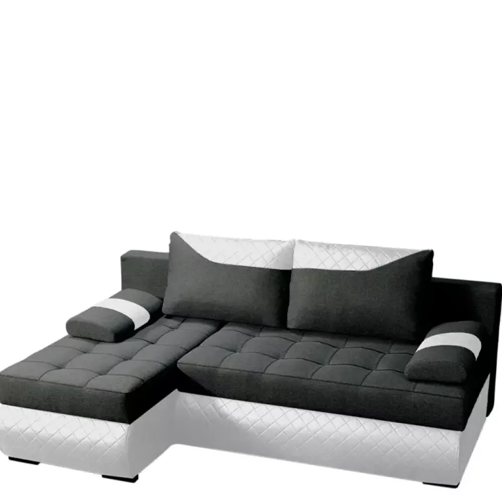 - Dwukolorowy narożnik do salonu, z funkcją spania o powierzchni 138×200 cm. Dwie poduszki służące jako oparcie, oraz dwie jako podłokietniki. Pod siedziskiem znajduje się pojemnik na pościel.