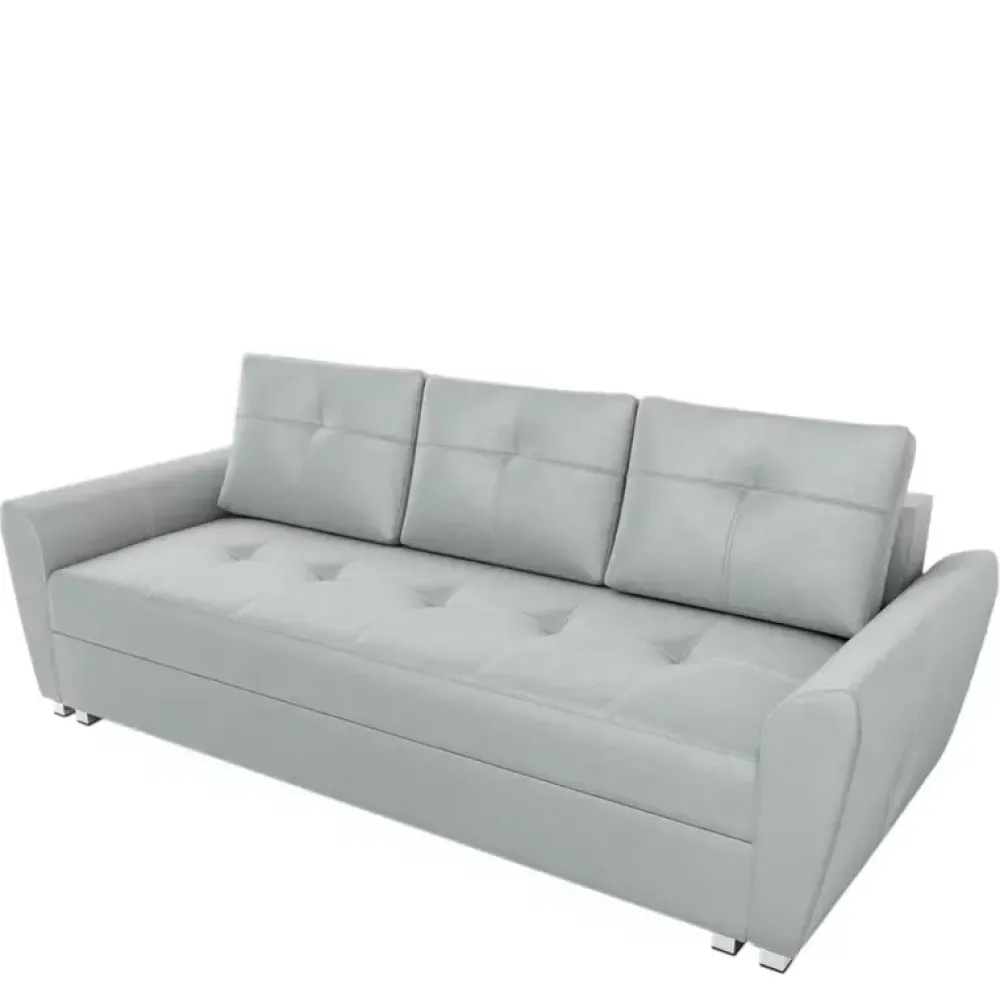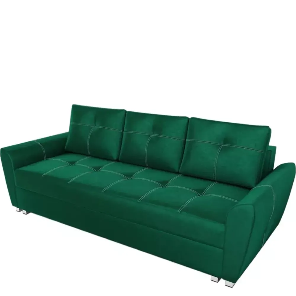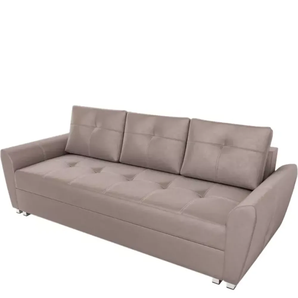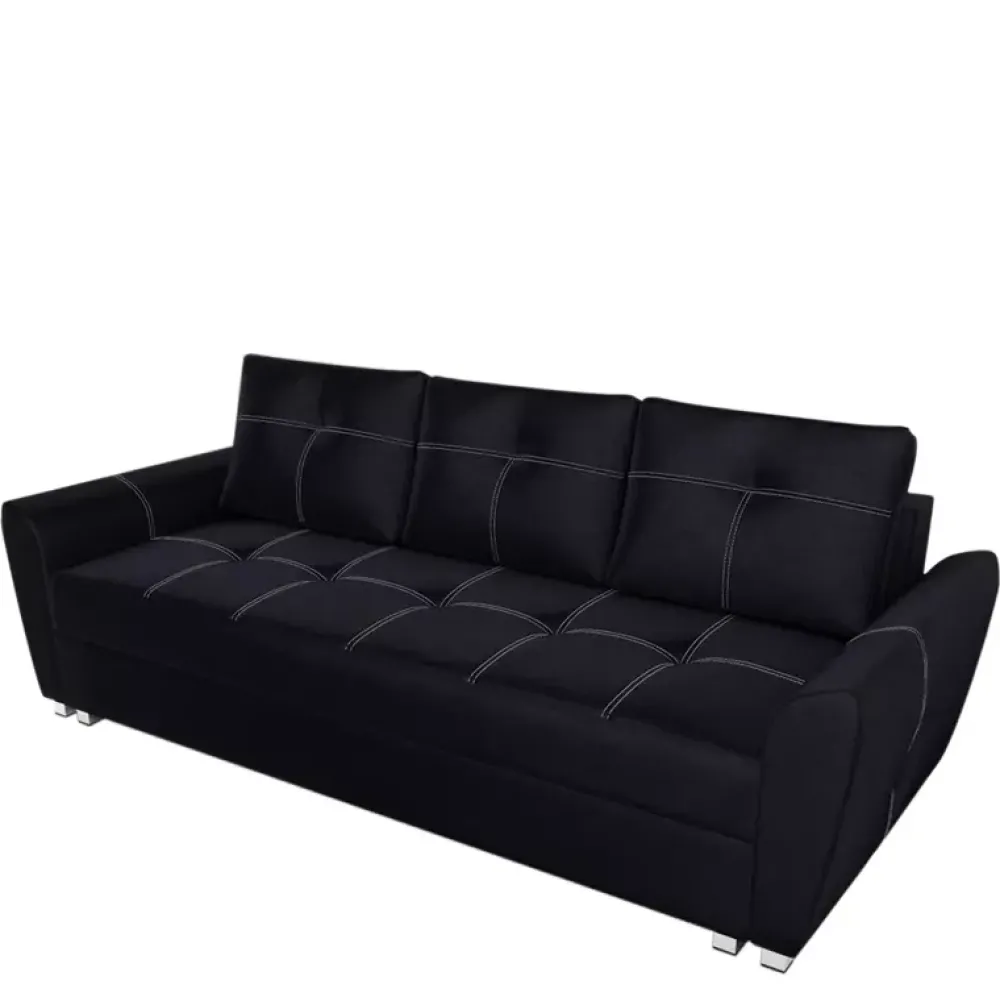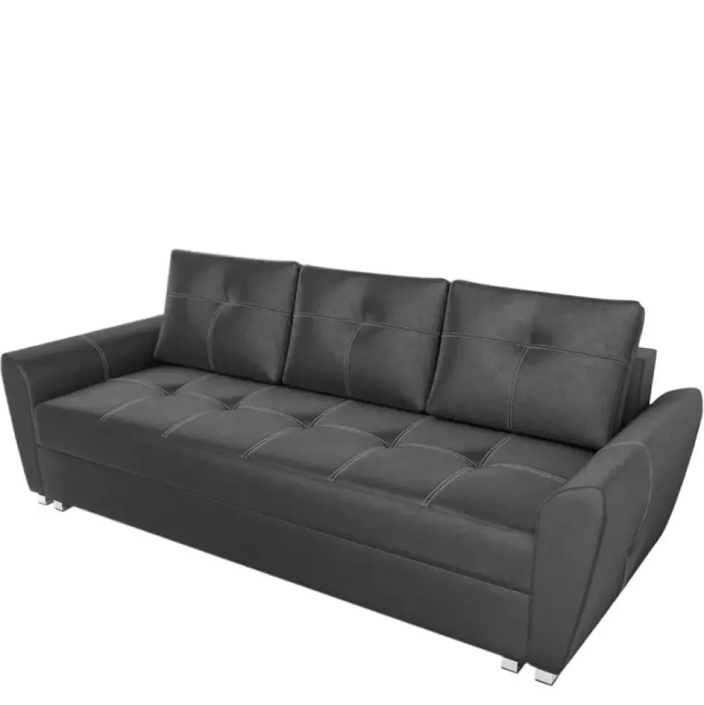 Sofa wykonana z wysokiej jakości materiałów, powierzchnię siedziska, poduszek oraz boczków ozdobiono przeszyciem białą nicią. Dzięki zastosowaniu mechanizmu DL rozkładania funkcji spania o powierzchni 150×200 cm jest bajecznie proste i wygodne, a jednocześnie do dyspozycji jest duży pojemnik na pościel. Komfort snu zapewnia siedzisko oraz oparcie wykonane ze sprężyn typu Bonell.