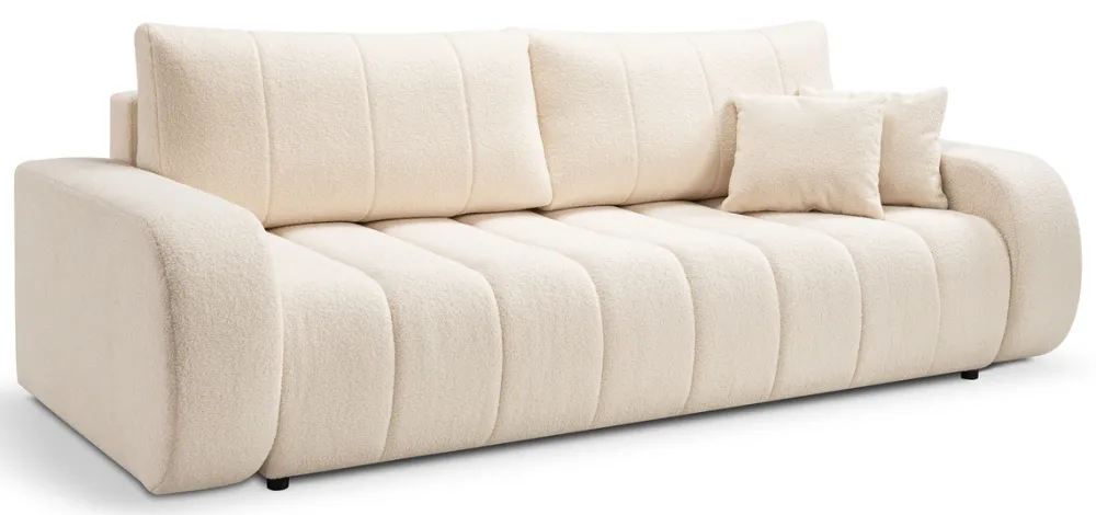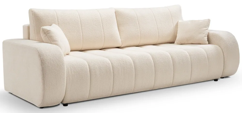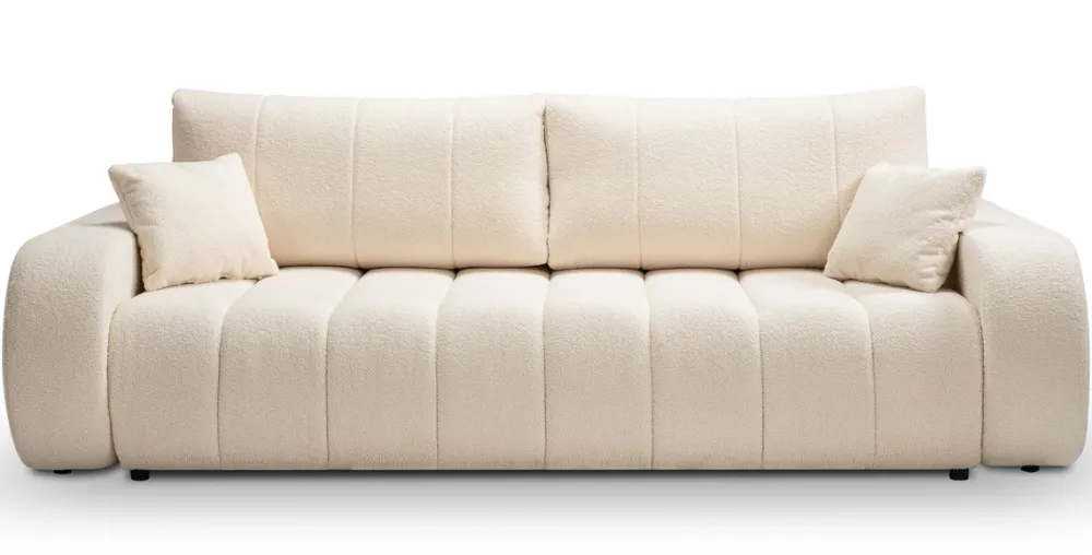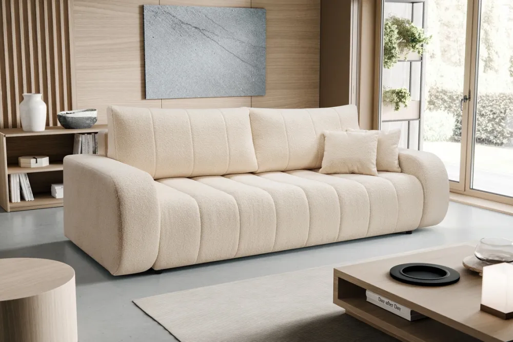 Beżowa sofa do salonu została obita tkaniną bucle, która zachwyca nie tylko wyglądem, ale również przyjemną w dotyku strukturą. Ozdobne przeszycia podkreślają nowoczesny design, nadając sofie elegancki i niepowtarzalny wygląd.