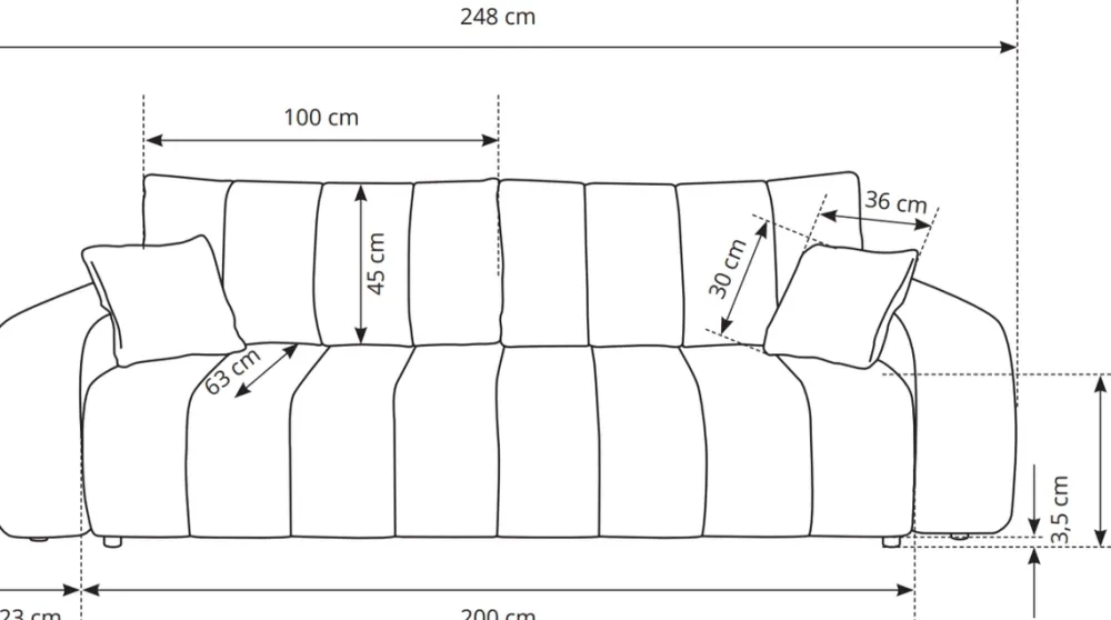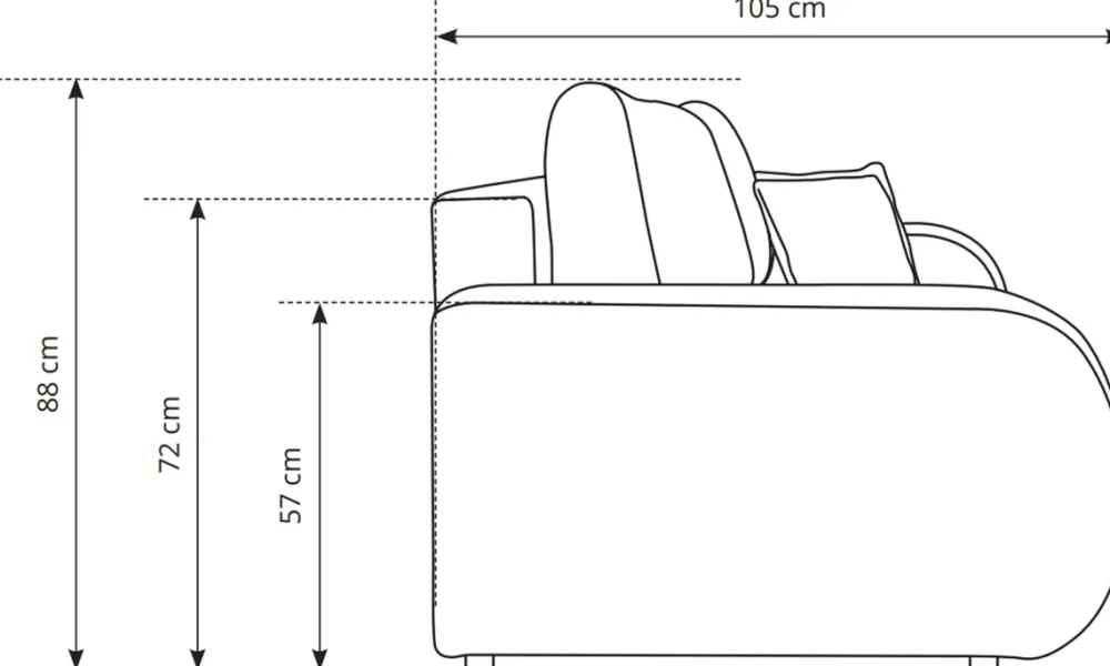 Siedzisko wypełnione pianką PUR zapewnia miękkość i doskonałe podparcie, zarówno podczas siedzenia, jak i spania. Dwie duże poduchy oparciowe oraz dwie mniejsze, ozdobne poduszki dodają przytulności i podkreślają stylowy charakter mebla.