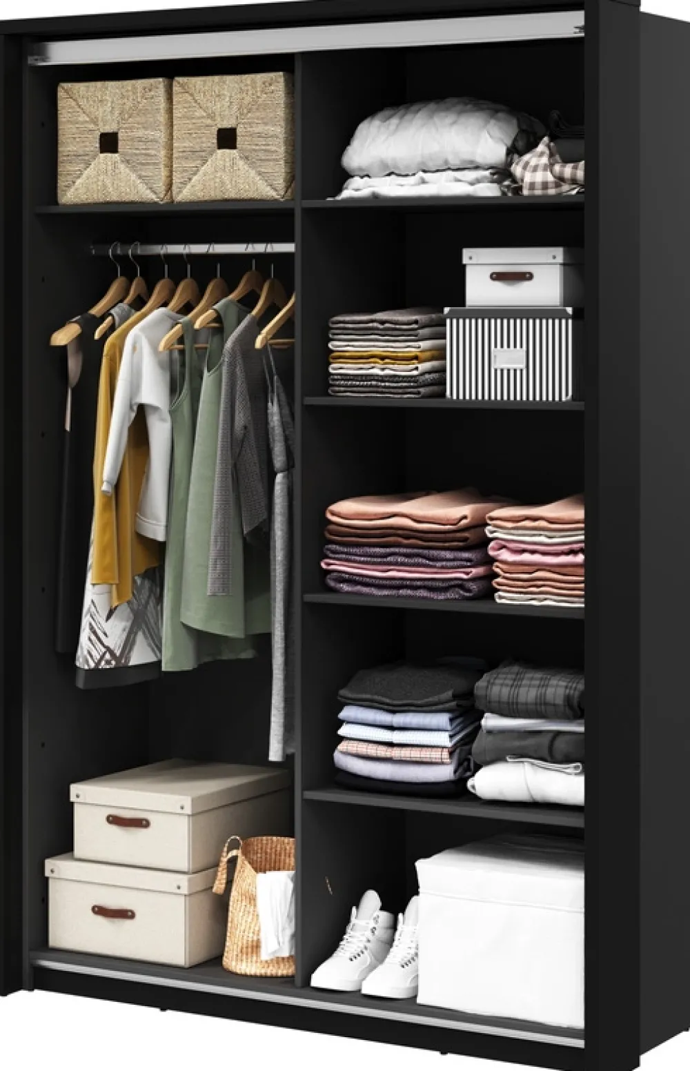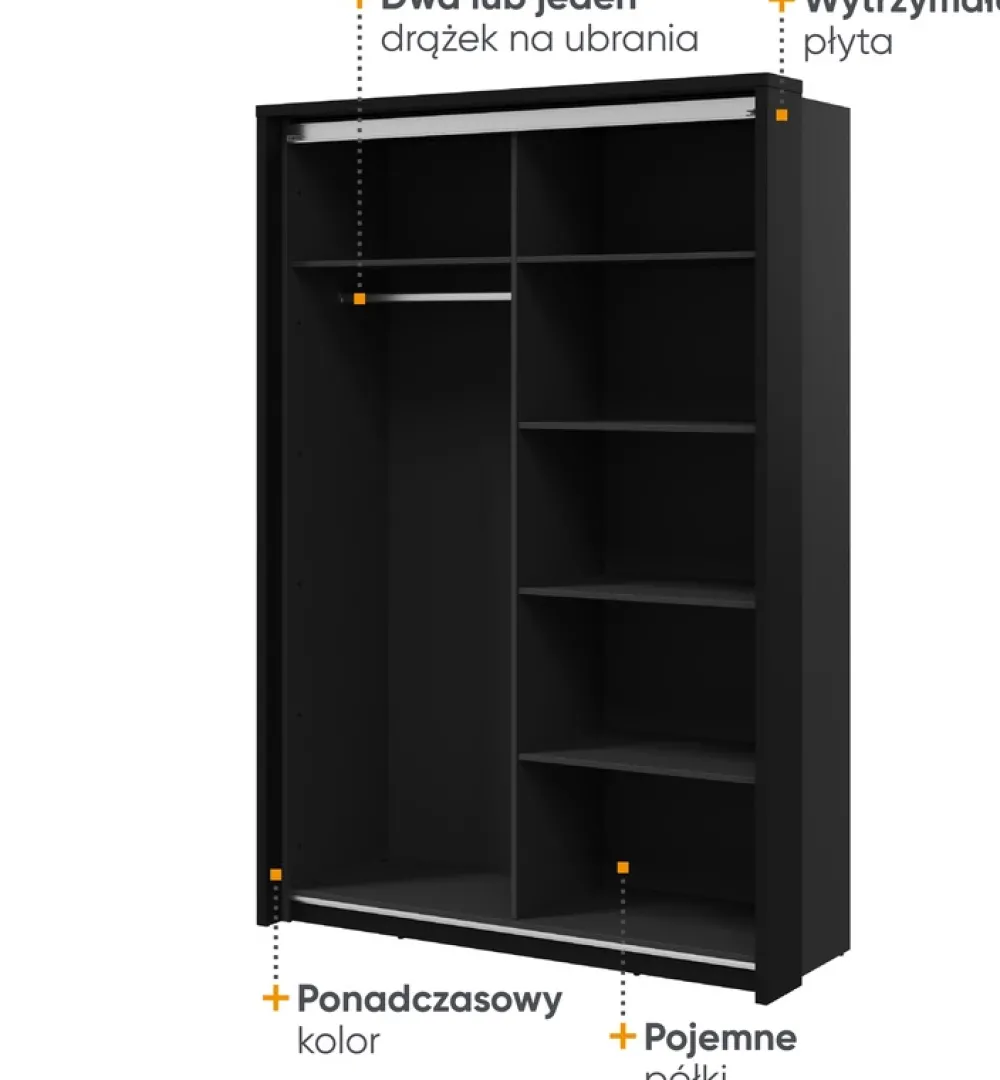 - Szafa przesuwna 160 cm ARTI została wyposażona w cztery półki na ubrania po prawej stronie oraz metalowy drążek na wieszaki i półkę nad nim po lewej stronie. Drzwi szafy poruszają się na aluminiowej prowadnicy, która gwarantuje płynną pracę.