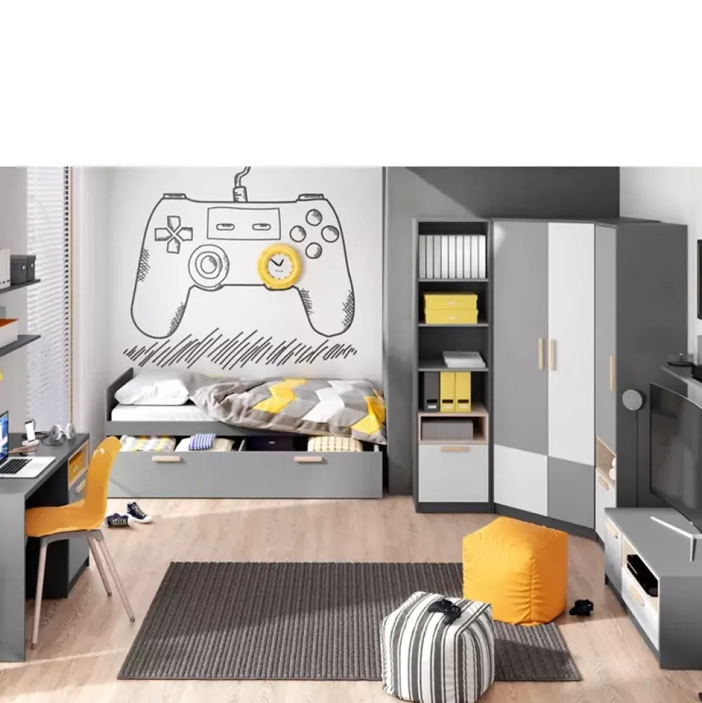 Młodzieżowa szafa narożna została również wyposażona w cztery półki gotowe na zagospodarowanie rozmaitymi elementami garderoby oraz dwa metalowe drążki na wieszaki z ubraniami o różnej długości. Ponadto szafa posiada również wysokie lustro z półkami znajdującymi się poniżej. Dodatkowo nowoczesna stylistyka szafy garderoby sprawia, że doskonale odnajduje się ona we współczesnych aranżacjach pokoi młodzieżowych.