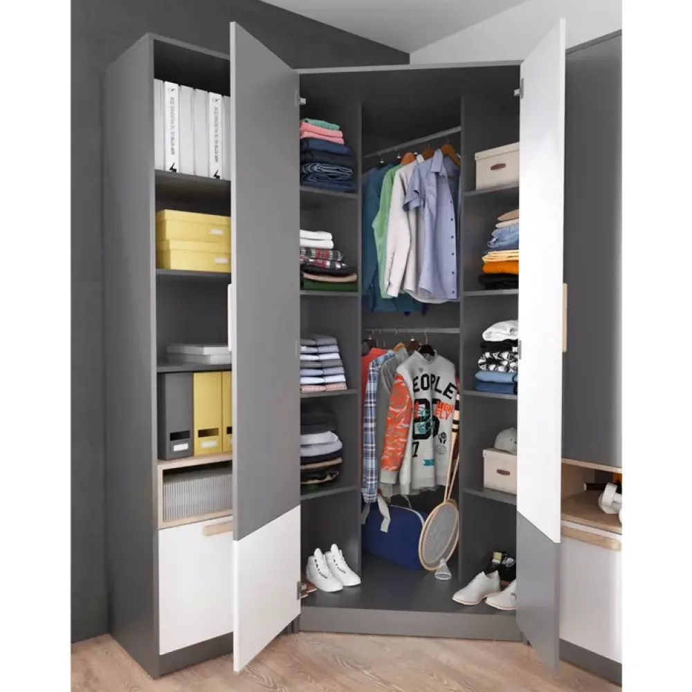Narożna szafa młodzieżowa POK to bardzo pojemna propozycja wykonana w nowoczesnej stylistyce, dzięki której doskonale wpisuje się we współcześnie panujące trendy wystroju wnętrz pokoi młodzieżowych.