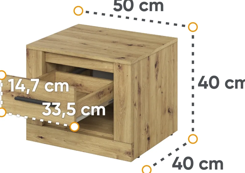 - Szafka nocna z szufladą ARTI została wykonana w kolorze dąb artisan, który swoim ciepłym odcieniem nadaje pomieszczeniu charakteru. Szuflada porusza się na prowadnicach rolkowych. Pod szufladą znajduje się wnęka. Uchwyt w czarnym kolorze.