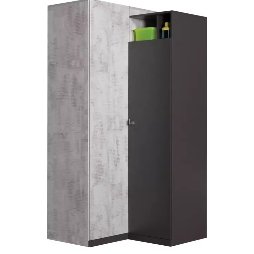 - Dwudrzwiowa szafa narożna z otwartą półką. Wnętrze zaaranżowano w dwa drążki na wieszaki, pionowy rząd półek po prawej stronie, nad drążkami znajduje się wspomniana wcześniej otwarta półka oraz druga zamykana.