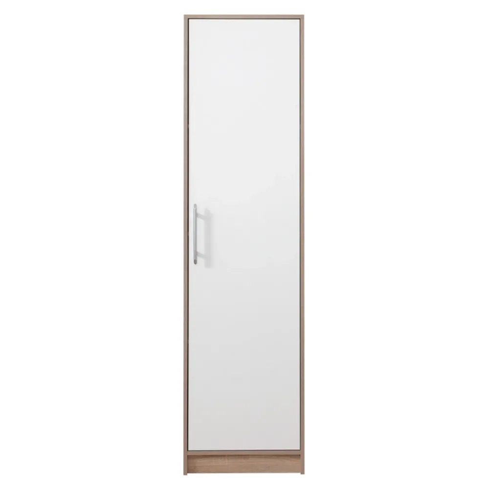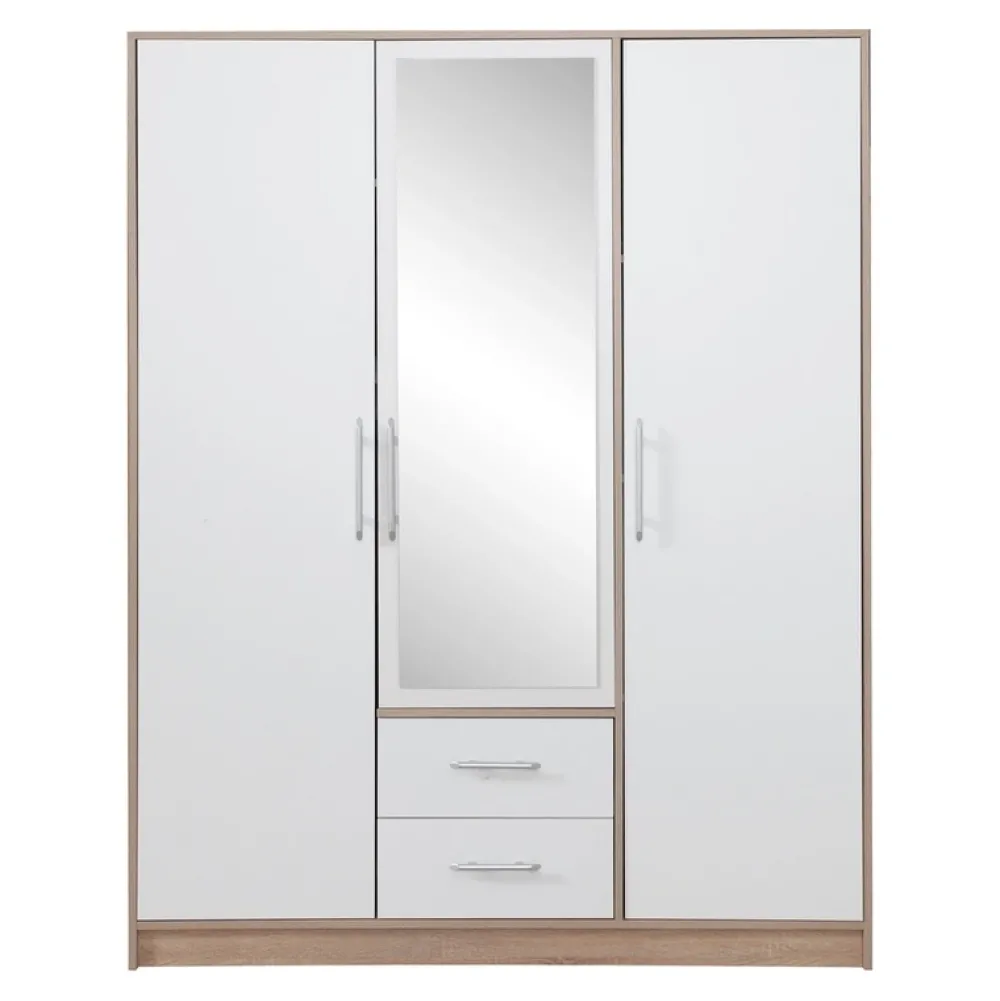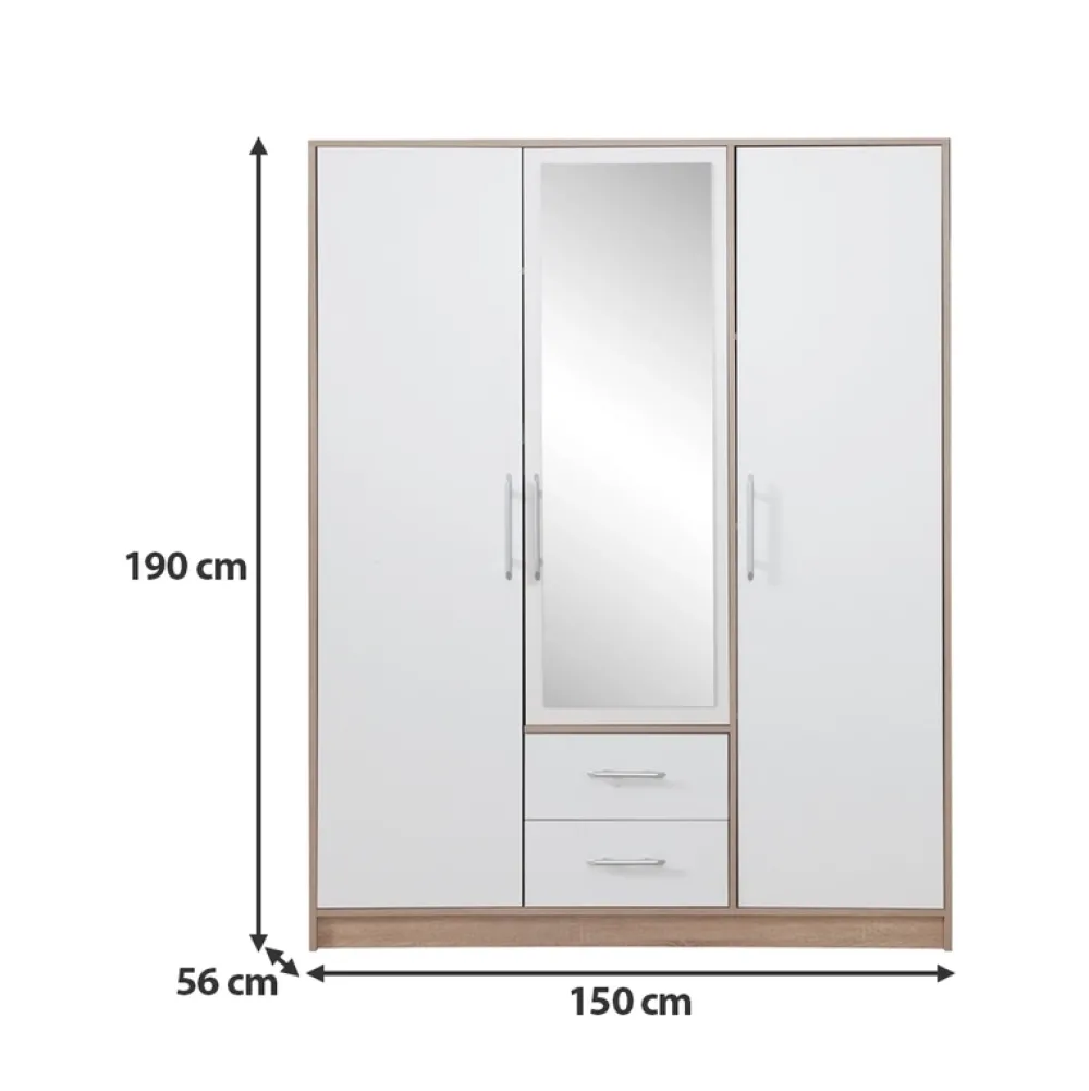 - Zestaw szaf SEVAS składa się z trzech brył, w skład których wchodzi szafa trzydrzwiowa z lustrem, szafa narożna z drążkami na wieszaki, oraz jednodrzwiowa szafa z półkami. Szafy wykonano w nowoczesnej stylistyce, natomiast obrzeża zabezpieczono ABS.