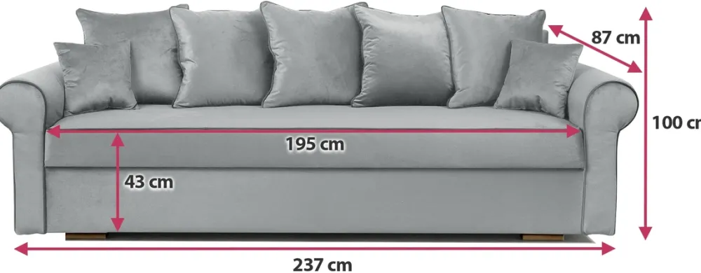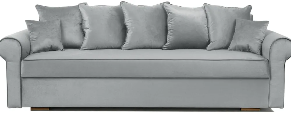 - Trzyosobowa kanapa rozkładana MALLORCA. Kanapa do salonu posiada drewniane nóżki, głęboki pojemnik na pościel, a także pięć dużych poduch oparciowych. Kanapa rozkłada się za pomocą automatu DL.