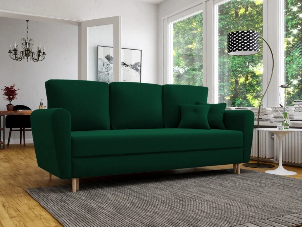 Ponadto kanapa zawiera głęboki pojemnik na pościel, który oferuje praktyczne i dyskretne miejsce do przechowywania pościeli, koców czy innych przedmiotów, pomagając utrzymać porządek i organizację w salonie.