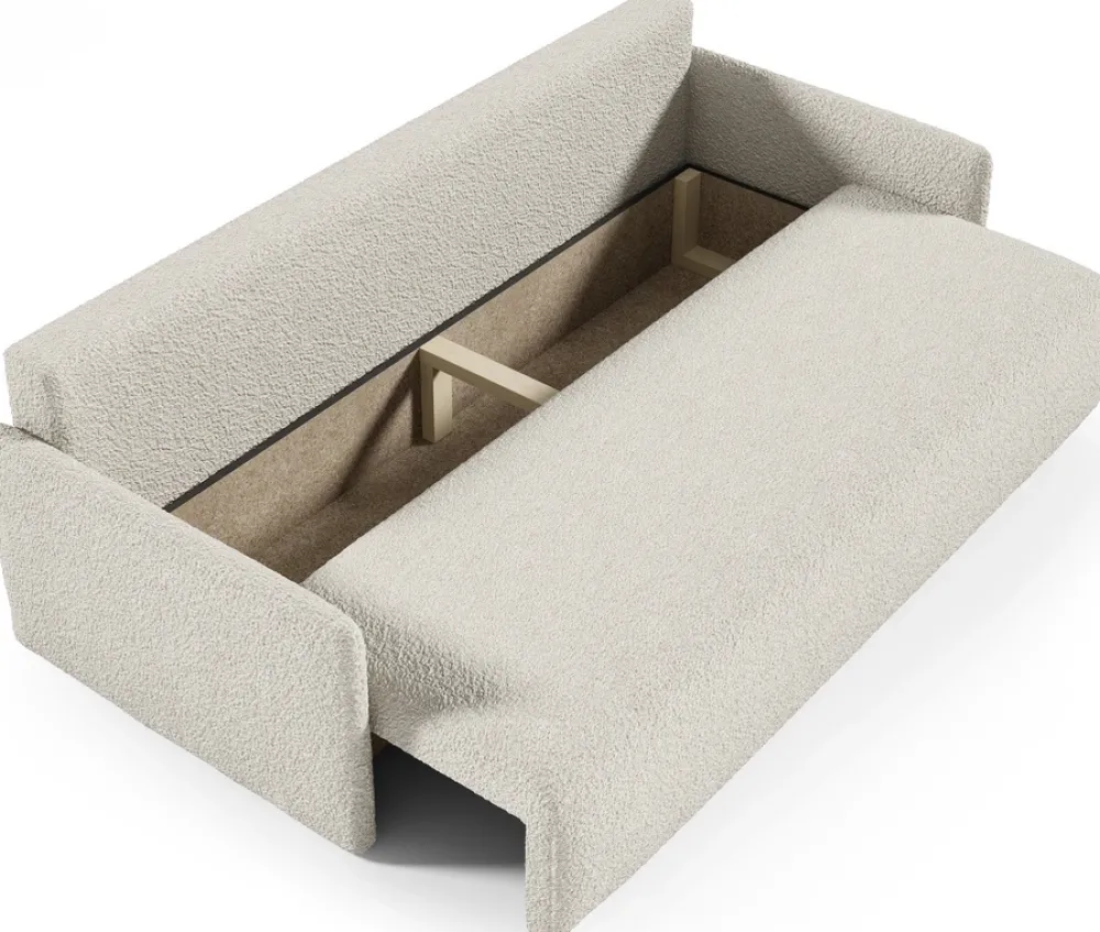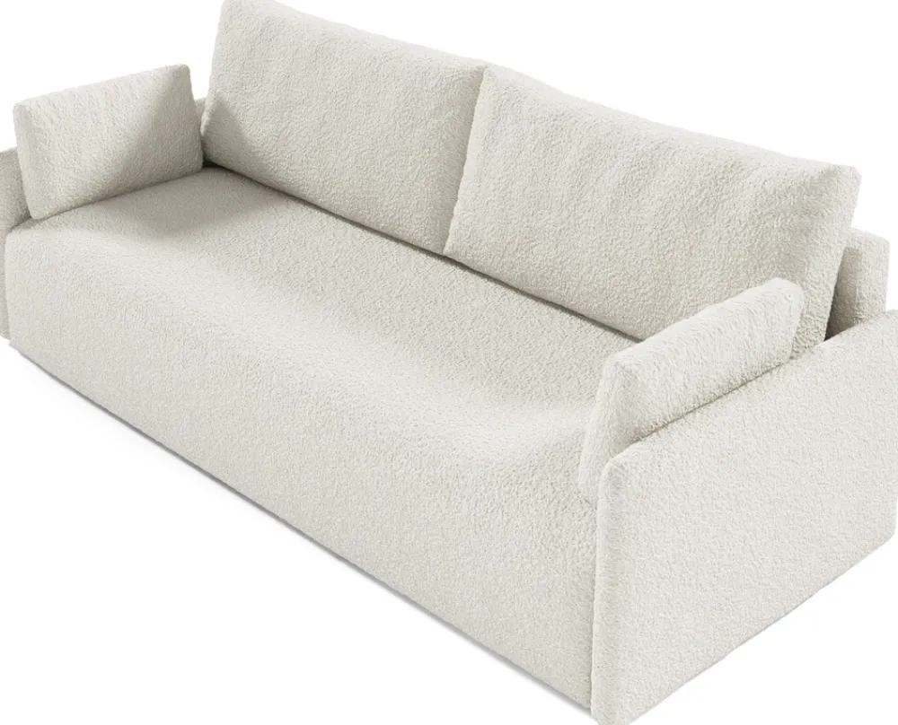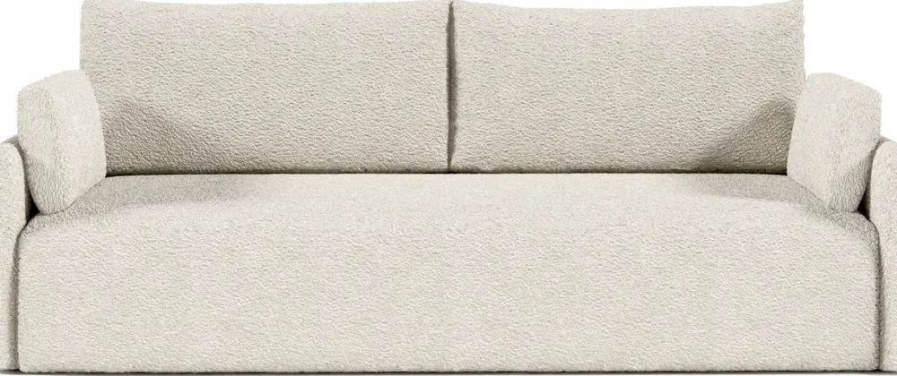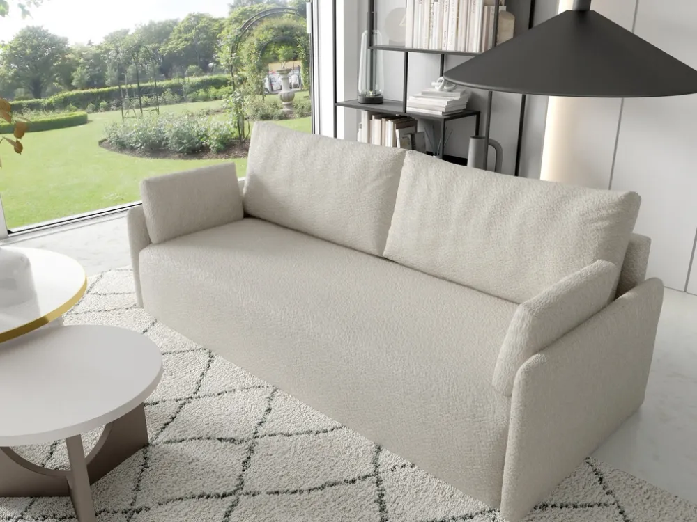 - Sofa z funkcją spania do salonu MOUSE. Sofa rozkładana wyposażona w komplet poduch, a także odporne na odkształcenia sprężyny faliste. Pod siedziskiem miejsce znalazł pojemnik na pościel. Na zdjęciach widoczna jest tkanina typu baranek.