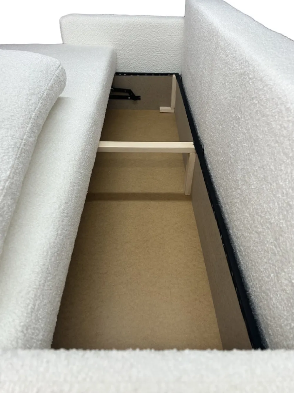 Zintegrowany z sofą głęboki pojemnik na pościel oferuje obfitą przestrzeń do przechowywania, pozwalając na łatwe i wygodne ukrycie pościeli, poduszek czy innych przedmiotów. Jest to szczególnie przydatne w mniejszych mieszkaniach lub tam, gdzie każdy centymetr przestrzeni ma znaczenie. Dzięki temu rozwiązaniu Twoje dodatkowe akcesoria są zawsze pod ręką, ale nie zajmują cennego miejsca.