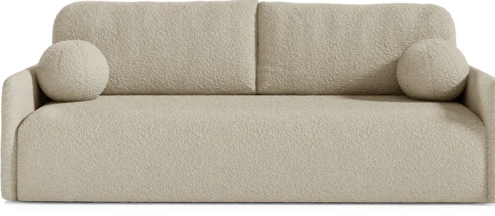 Sofa z funkcją spania wyposażona jest w dwie duże poduchy oparciowe, które gwarantują odpowiednie podparcie dla Twoich pleców i kręgosłupa podczas wypoczynku. Dodatkowo dwie małe poduszki w formie kul dodają charakteru i stylu całej kompozycji, stanowiąc piękny element dekoracyjny.