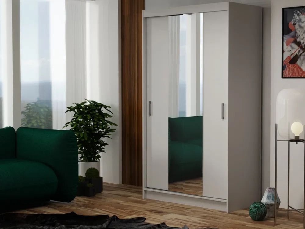 - Biała szafa przesuwna z lustrem 100 cm NASTE posiada pięć półek na ubrania oraz aluminiowy drążek na wieszaki. Lustro umieszczone na froncie optycznie powiększa, oraz rozjaśnia pomieszczenie. Drzwi poruszają się na metalowym systemie przesuwnym.
