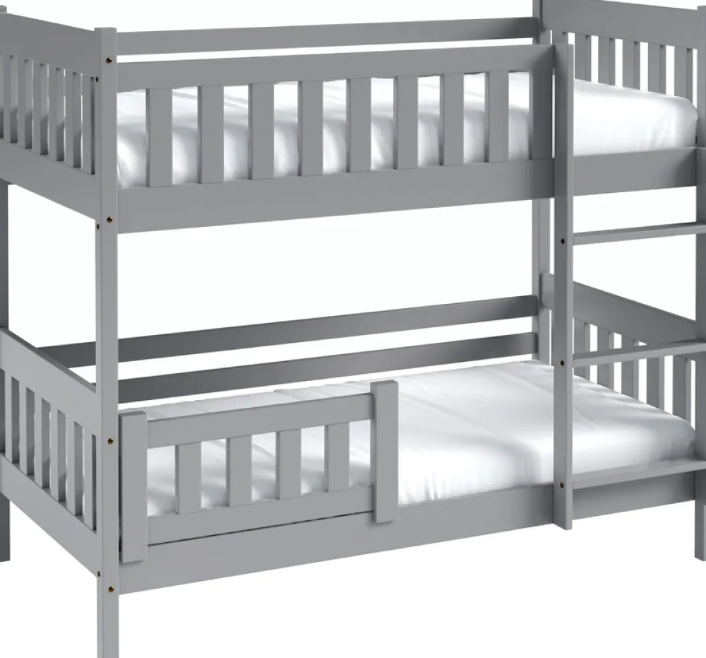- Łóżko dziecięce wykonane z drewna sosnowego. Drewno sosnowe jest cenione za swoją trwałość i solidność, co gwarantuje, że łóżko posłuży przez wiele lat. Ten wariant występuję w wybarwieniu szarym.