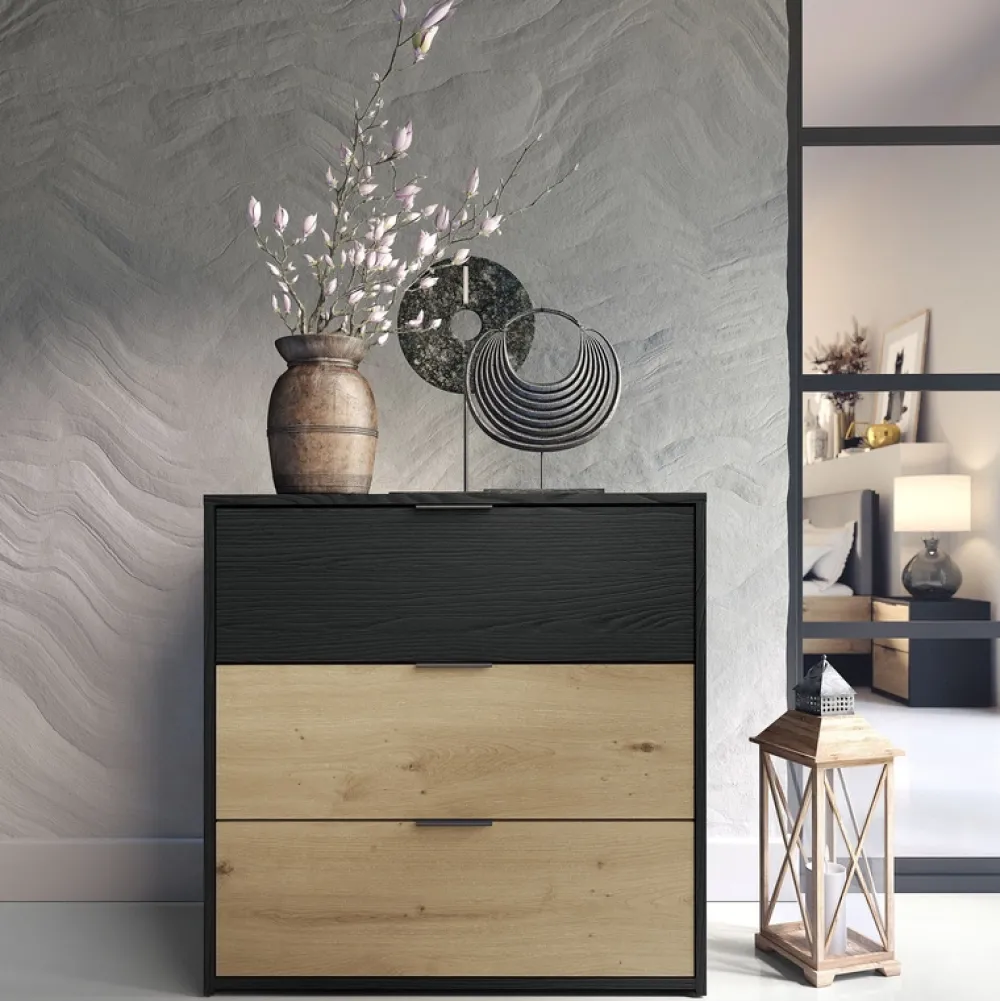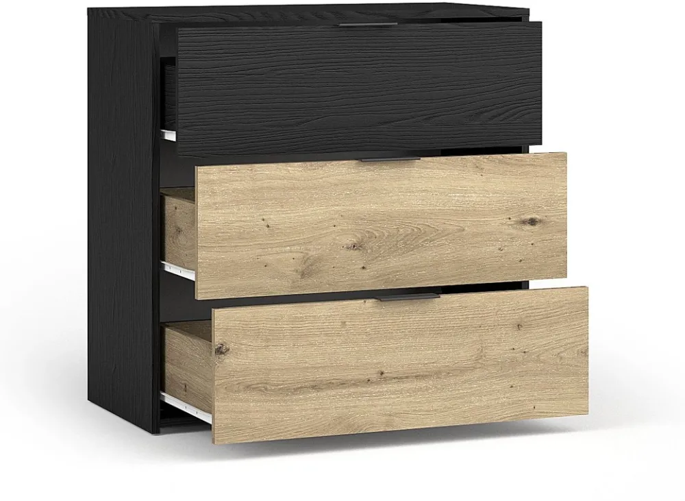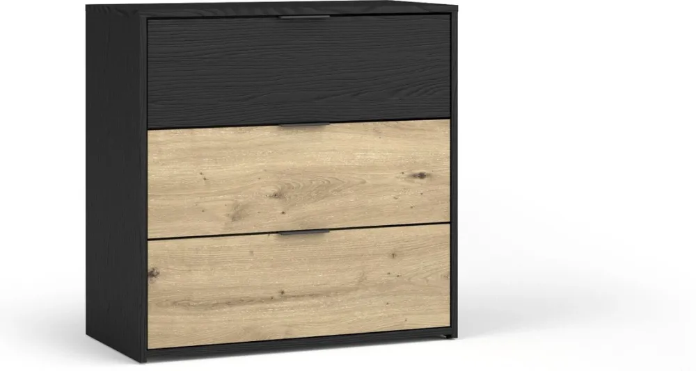 - Mała komoda UTOPIA 80 cm w kolorze czarny grafit/dąb artisan z 3 szufladami to eleganckie i praktyczne rozwiązanie do sypialni. Kompaktowa, trwała i łatwa w pielęgnacji, zapewnia wygodne przechowywanie i dodaje wnętrzu nowoczesnego charakteru.