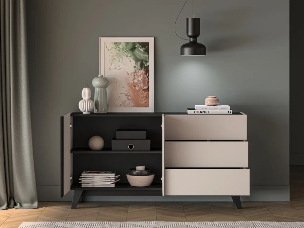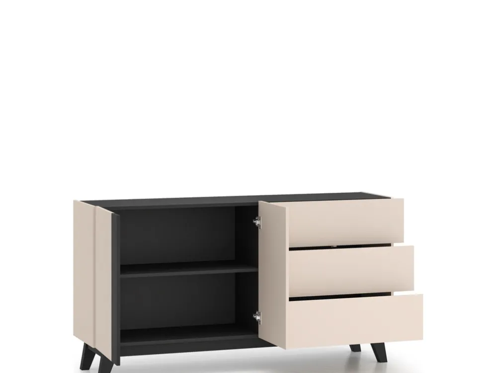 - Duża komoda młodzieżowa FERIO łączy elegancję i funkcjonalność. Kaszmirowe fronty, czarny korpus, trzy szuflady i dwie wnęki za drzwiami tworzą praktyczny mebel do salonu, sypialni lub jadalni. Idealna do nowoczesnych, uporządkowanych wnętrz.