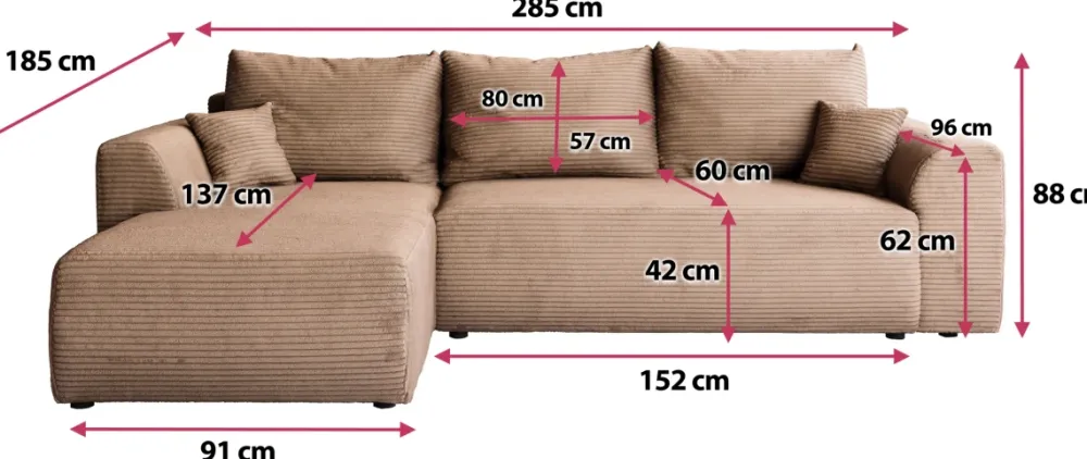 Siedzisko narożnika zostało wypełnione wysokiej jakości pianką PUR i sprężynami falistymi, co zapewnia odpowiednie podparcie ciała zarówno podczas siedzenia, jak i podczas snu. Trzy duże poduszki oparciowe oraz dwie mniejsze poduszki dekoracyjne zapewniają dodatkowy komfort i nadają narożnikowi przytulny wygląd.