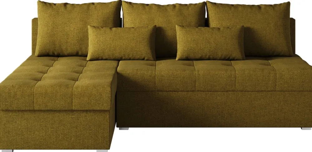 Wygodne, pikowane siedzisko dodaje narożnikowi elegancji, a jednocześnie zapewnia komfortowe podparcie. Na oparciu znajdują się trzy duże poduszki, które tworzą przytulne miejsce do oparcia, oraz dwa mniejsze jaśki, które można dowolnie układać, zapewniając wygodę i wsparcie podczas odpoczynku.
