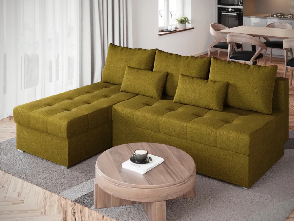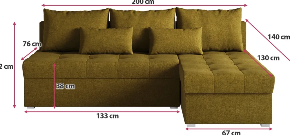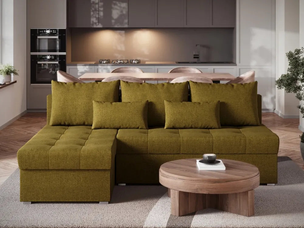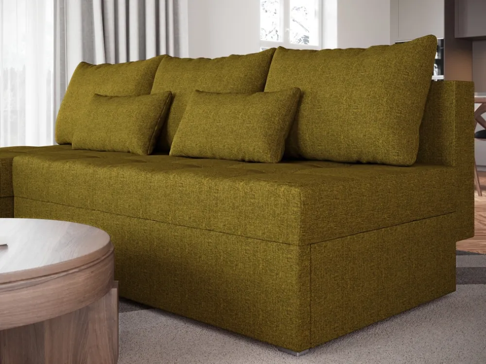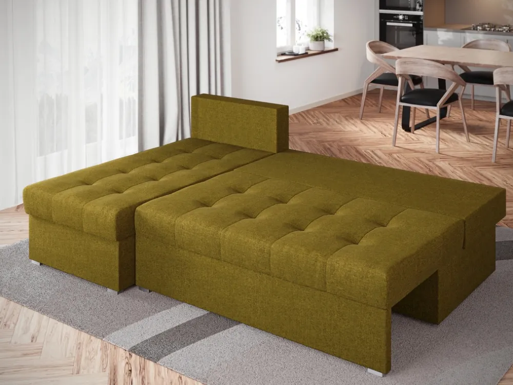 Narożnik wyposażony jest w funkcję spania, co sprawia, że w kilka chwil można zamienić go w łóżko o powierzchni 120×200 cm. To praktyczne rozwiązanie, które idealnie sprawdzi się podczas wizyt gości, a także pozwoli zaoszczędzić miejsce w salonie. Pod siedziskiem znajduje się pojemny schowek na pościel, który umożliwia wygodne przechowywanie koców, poduszek czy dodatkowej pościeli – wszystko w zasięgu ręki.