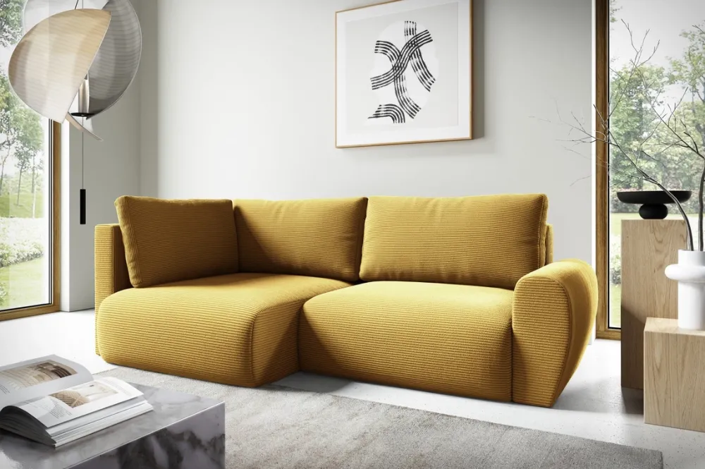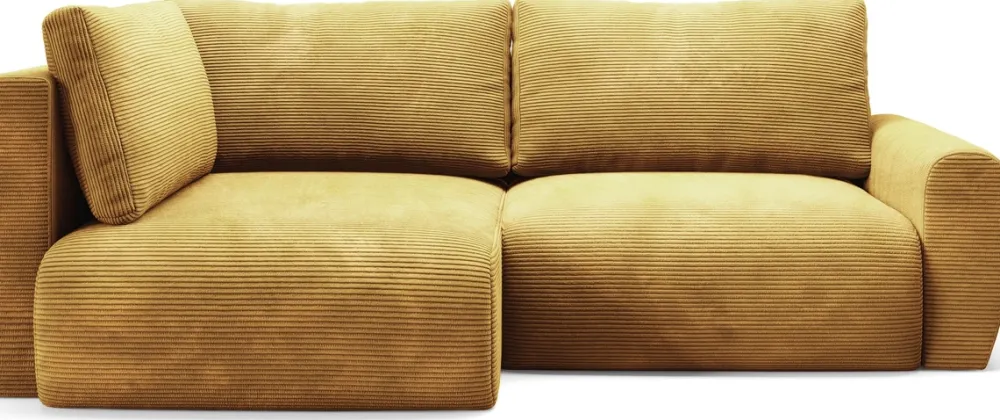 - Narożnik posiada tapicerowane plecy w tej samej tkaninie co reszta mebla, oznacza to, że można ustawić mebel nawet pośrodku salonu.