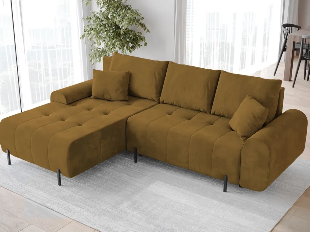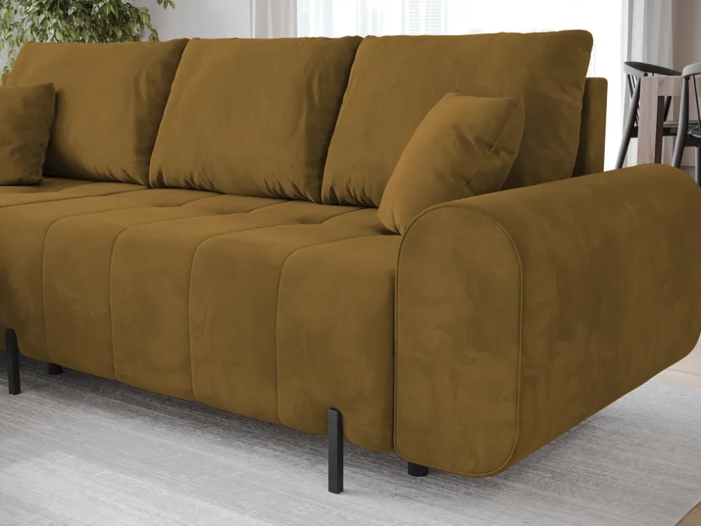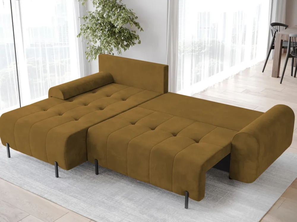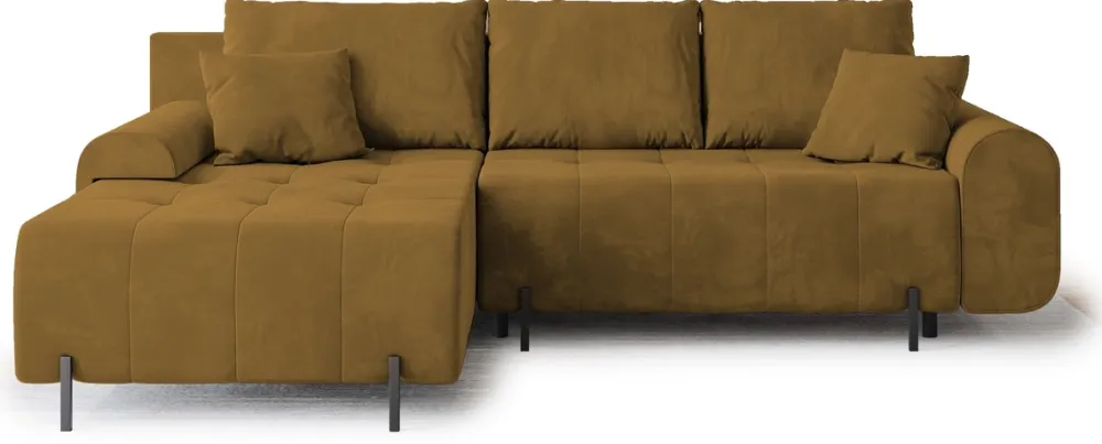 Pod siedziskiem narożnika znajduje się pojemnik na pościel, który umożliwia łatwe i dyskretne przechowywanie pościeli lub innych przedmiotów. Jest to idealne rozwiązanie dla tych, którzy cenią sobie porządek i efektywne wykorzystanie przestrzeni w swoim salonie.