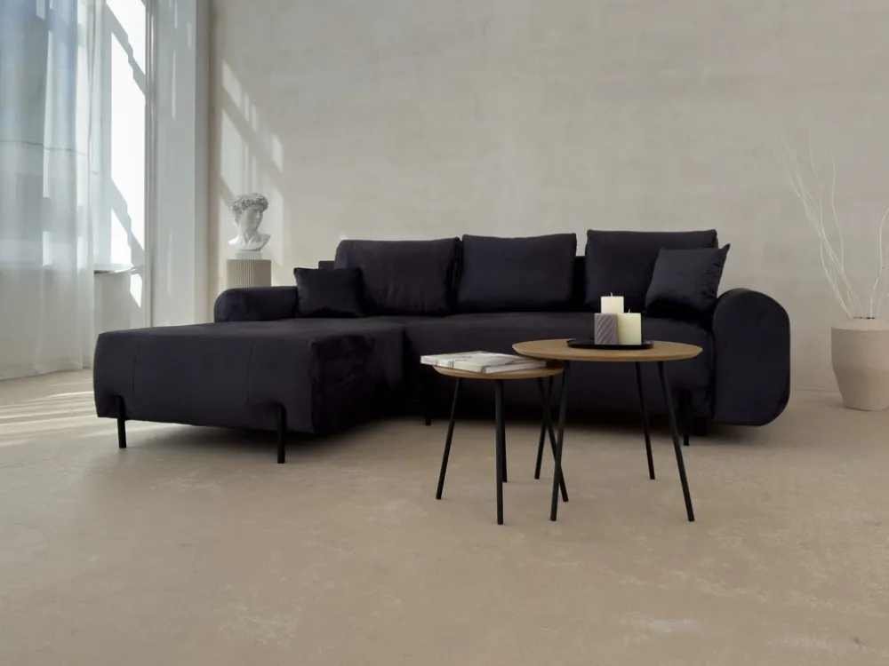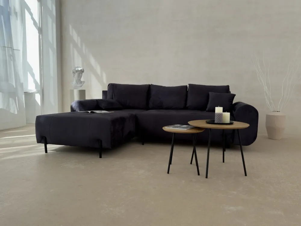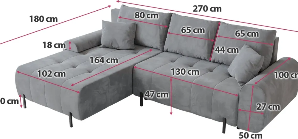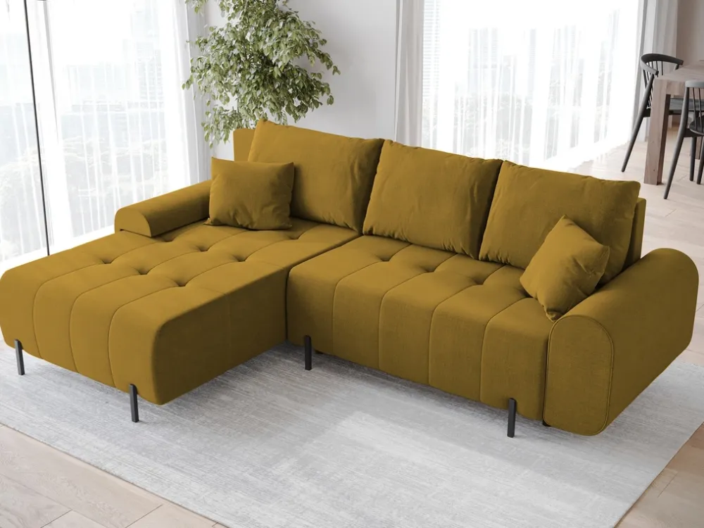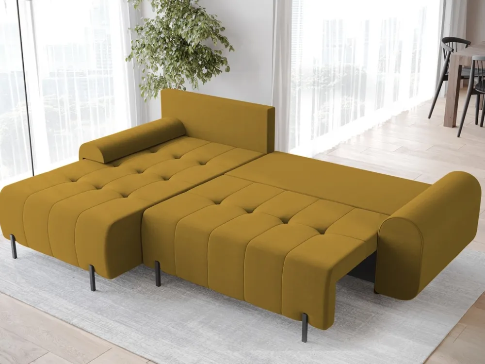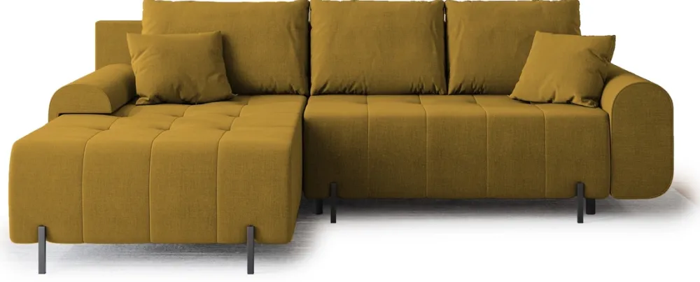 Pod siedziskiem narożnika znajduje się pojemnik na pościel, który umożliwia łatwe i dyskretne przechowywanie pościeli lub innych przedmiotów. Jest to idealne rozwiązanie dla tych, którzy cenią sobie porządek i efektywne wykorzystanie przestrzeni w swoim salonie.