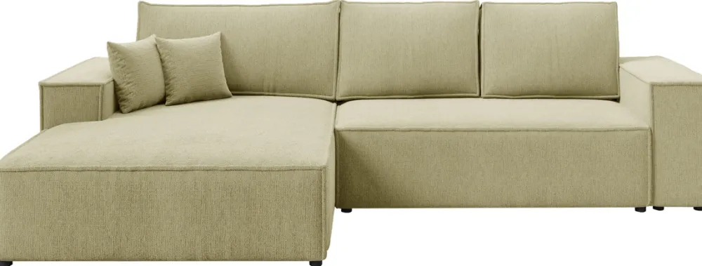 Dostępny w orientacji lewo lub prawostronnej, narożnik ten można dostosować do układu pomieszczenia. Tapicerowane plecy w tej samej tkaninie, co reszta mebla, pozwalają na swobodne ustawienie w dowolnym miejscu, a eleganckie, miękkie poduszki – trzy duże i dwie mniejsze – podnoszą komfort użytkowania, jednocześnie dodając stylu całej konstrukcji.