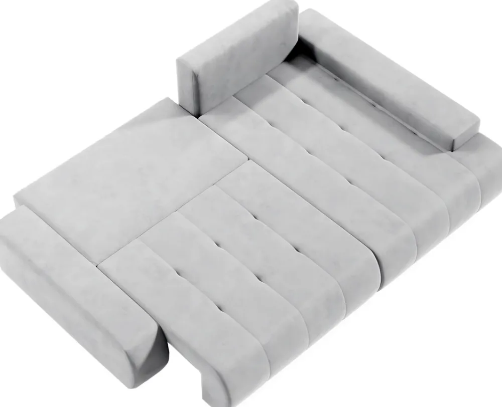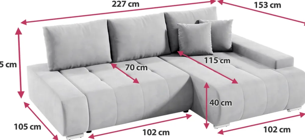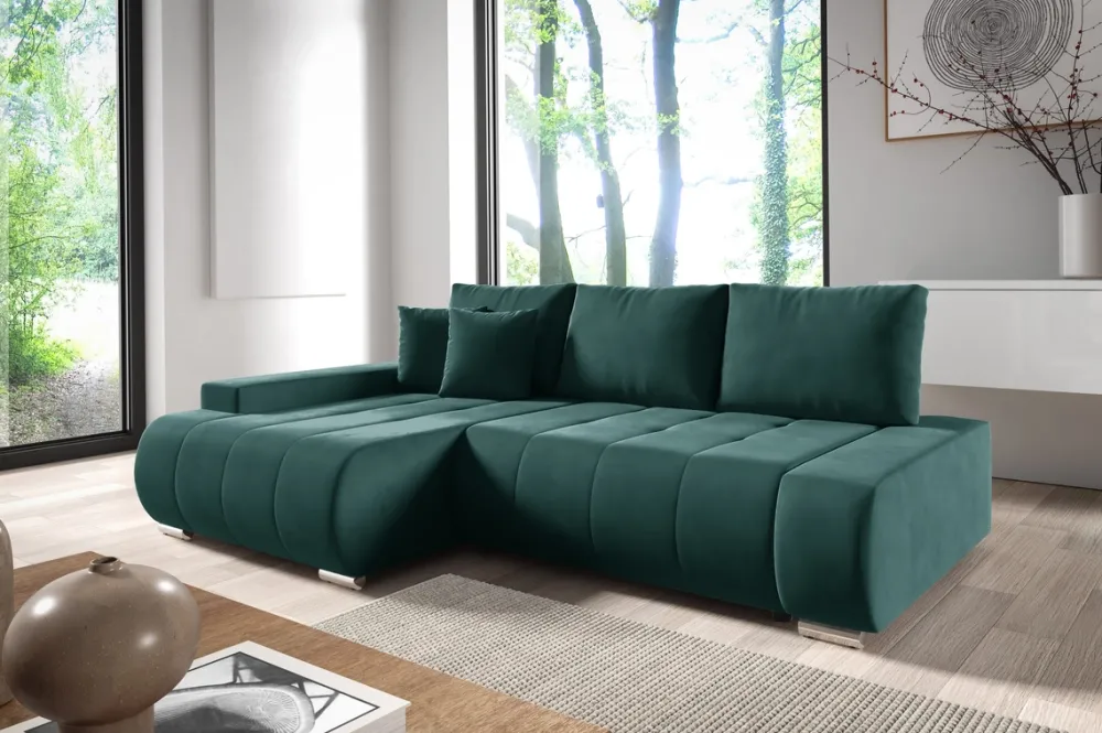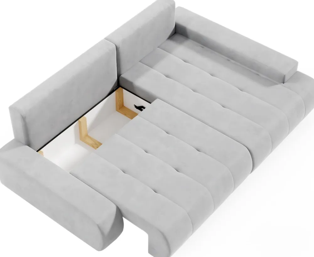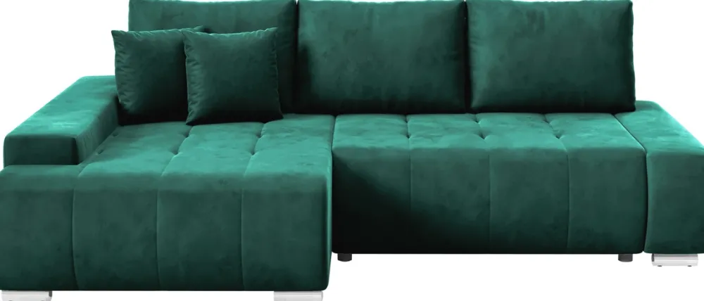 Welurowy narożnik z funkcją spania jest również bardzo funkcjonalny, dzięki pojemnikowi na pościel umieszczonemu pod siedziskiem, co jest praktycznym rozwiązaniem dla oszczędzania przestrzeni. Dodatkowo rozkładany narożnik został wyposażony w komplet poduch – trzy duże poduchy dbające o odpowiednie oparcie oraz dwie mniejsze, które zwiększają komfort użytkowania.