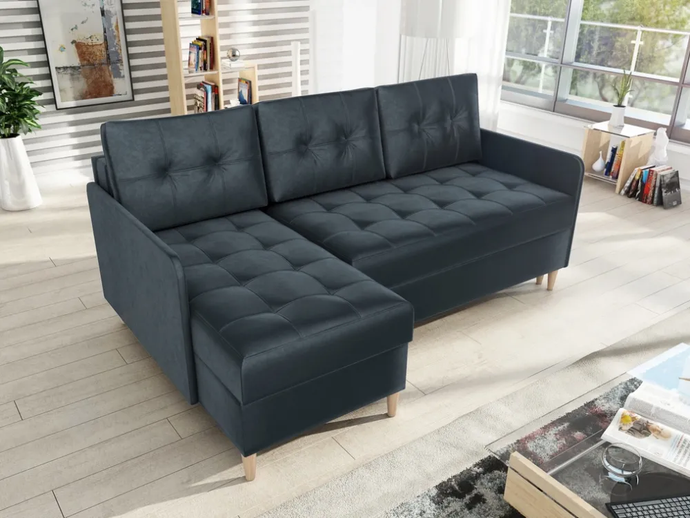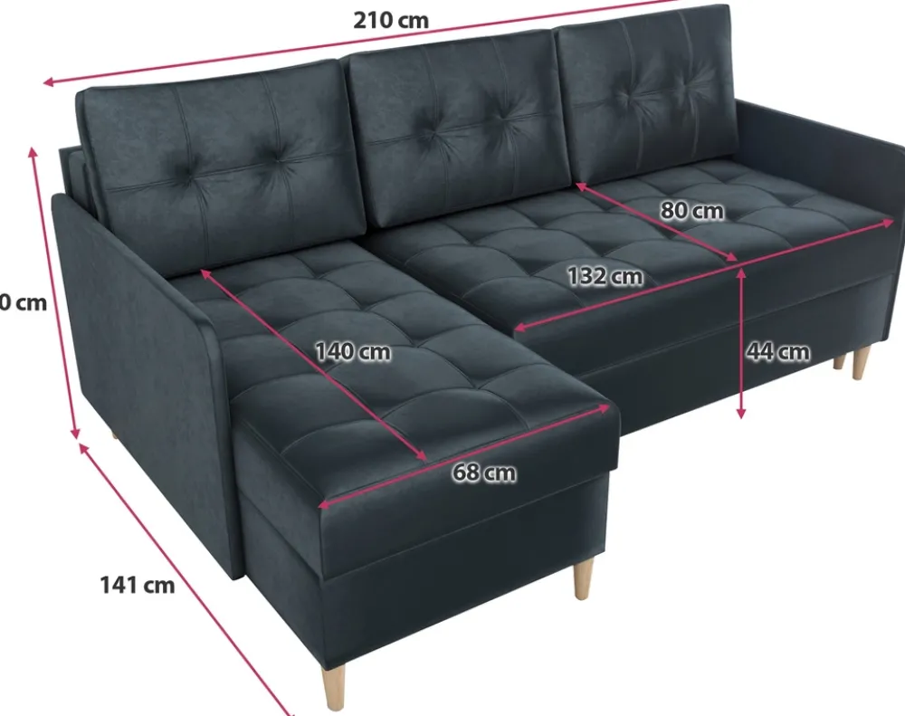 Pod siedziskiem narożnika znajduje się pojemny schowek na pościel, który ułatwia przechowywanie kołder, poduszek czy koców. Dzięki temu możesz zaoszczędzić miejsce w szafie, a wszystkie niezbędne rzeczy zawsze mieć pod ręką. Pojemnik na pościel to świetne rozwiązanie dla osób, które cenią sobie funkcjonalność i porządek w salonie.