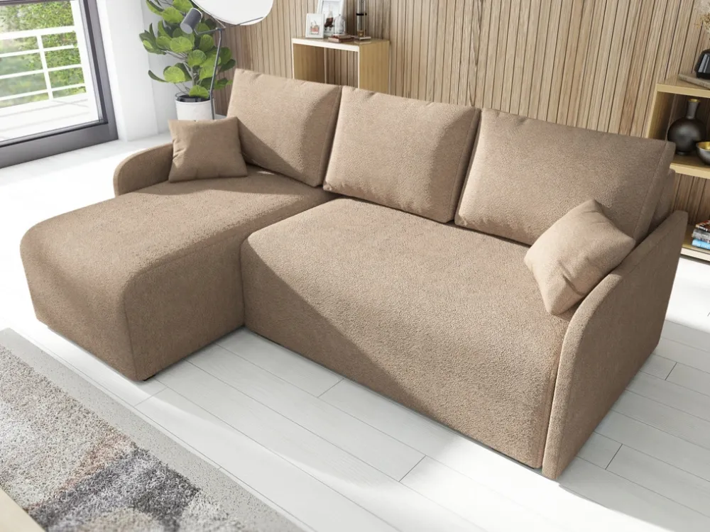 Narożnik wyposażony jest w pojemnik na pościel, który znajduje się pod siedziskiem. To niezwykle funkcjonalne rozwiązanie pozwala na wygodne przechowywanie kołder, poduszek i innych niezbędnych rzeczy, które w każdej chwili będą w zasięgu ręki. Dzięki temu łatwo utrzymasz porządek w salonie, bez potrzeby dodatkowych szafek czy komód.