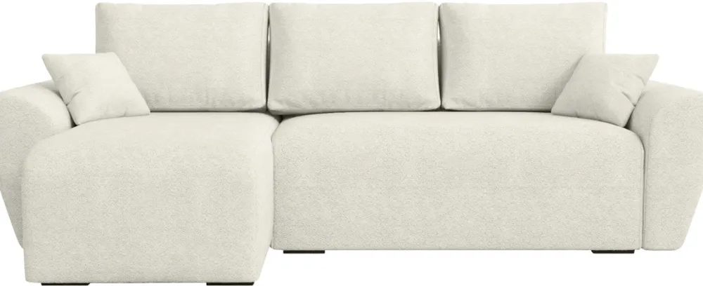 Tapicerka narożnika wykonana jest z wysokiej jakości tkaniny boucle, która charakteryzuje się pętelkową, miękką strukturą, przypominającą futro baranka. Ten materiał jest nie tylko przyjemny w dotyku, ale również wyjątkowo trwały i odporny na codzienne użytkowanie, co czyni go idealnym wyborem do salonu.