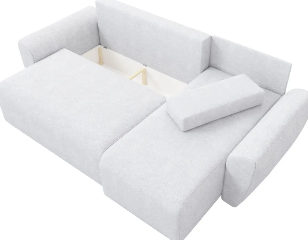 Pod siedziskiem narożnika znajduje się pojemny schowek na pościel, który ułatwia organizację przestrzeni. To praktyczne rozwiązanie pozwala na wygodne przechowywanie kołdry, poduszek czy koców, zawsze pod ręką, bez konieczności dodatkowych mebli.