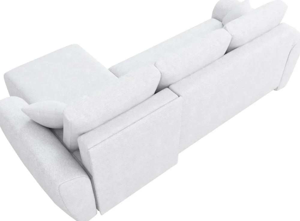 - Narożnik posiada tapicerowane plecy wykonane w tej samej tkaninie, co reszta mebla, dzięki czemu świetnie prezentuje się w dowolnym miejscu w salonie, nawet na środku pomieszczenia.