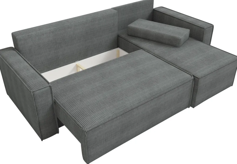Pod siedziskiem narożnika znajduje się pojemny schowek na pościel, który pomoże w organizacji przestrzeni. To idealne miejsce do przechowywania kołder, poduszek czy koców, dzięki czemu Twój salon pozostanie zawsze schludny i uporządkowany. Pojemnik na pościel to nie tylko funkcjonalność, ale także sposób na oszczędność miejsca.