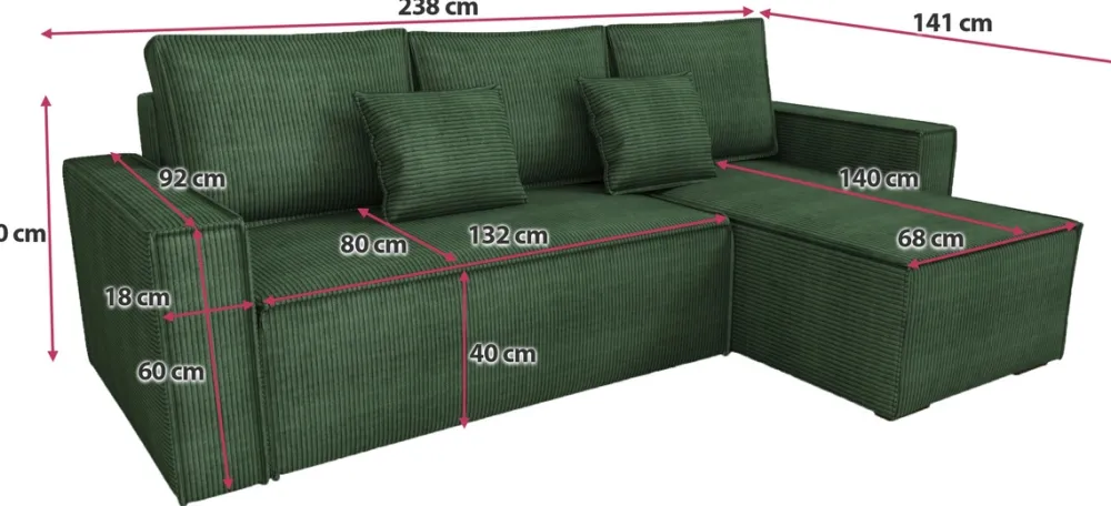 - Sztruksowy narożnik DEXTER posiada funkcję spania o wymiarze 138×200 cm, która pozwala na okazjonalny sen dla gości. Pod siedziskiem znajduje się głęboki pojemnik na poduszki i koce. Narożnik jest dostępny w wielu atrakcyjnych kolorach.