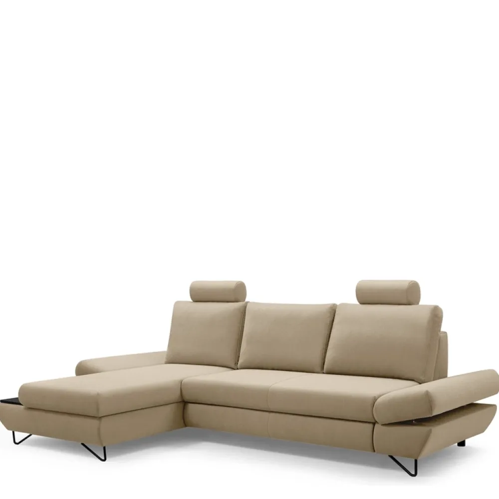 - Przedstawiamy nowoczesny narożnik LORENS oparty na wysokich metalowych nóżkach. Wykonany jest z wysokiej jakości materiałów oraz posiada funkcję spania, dwa regulowane podłokietniki, pojemnik na pościel, a także półkę z boku otomany.
