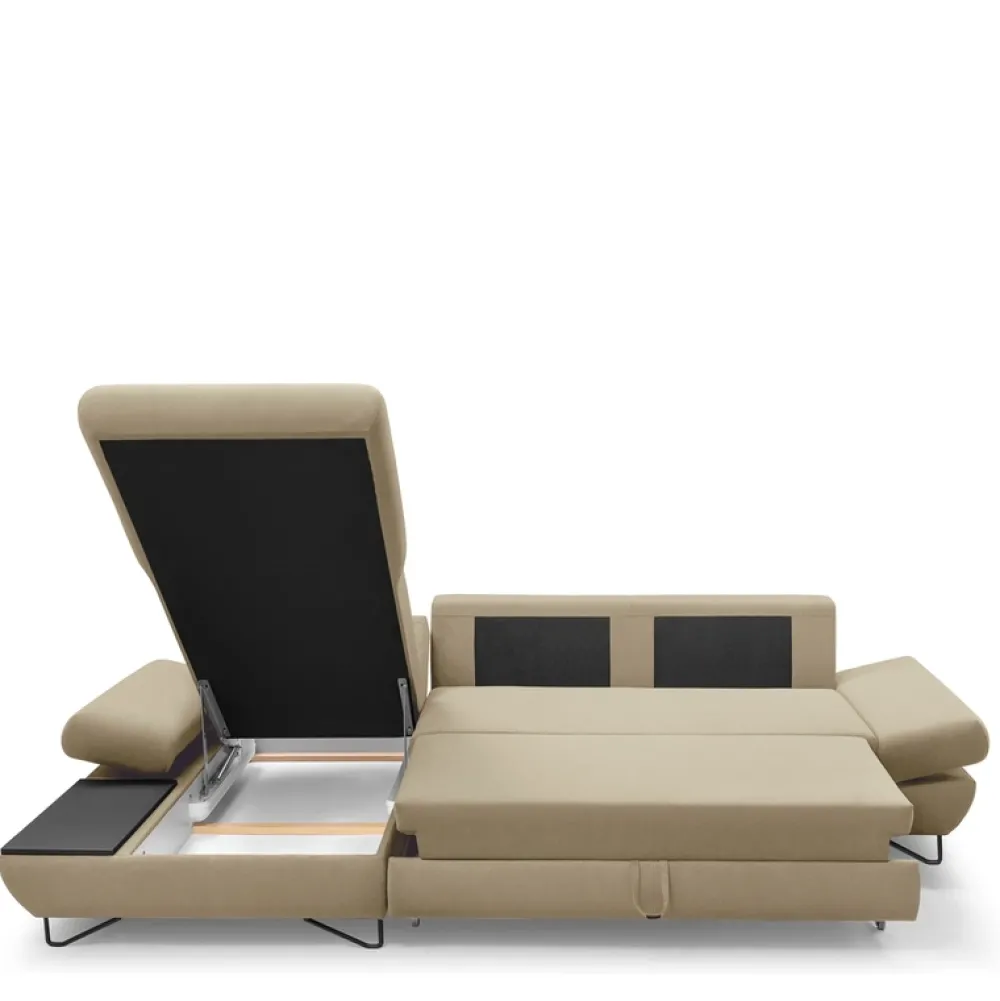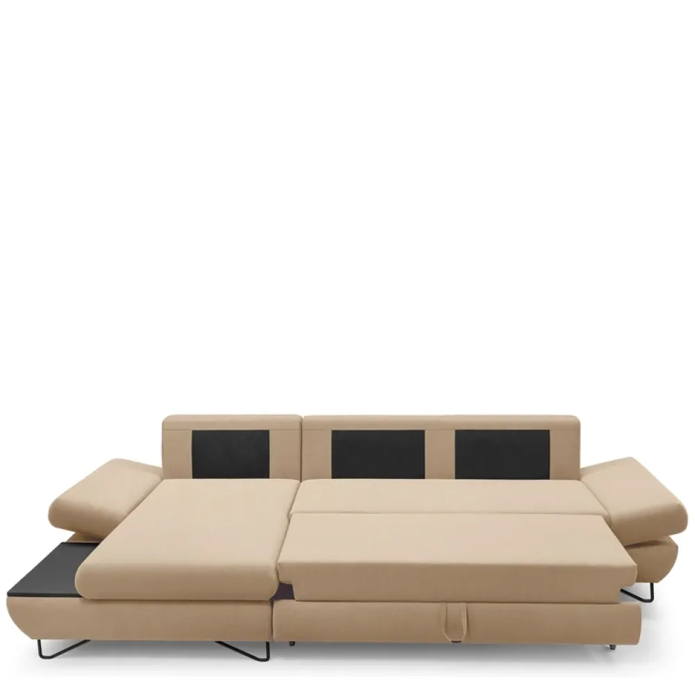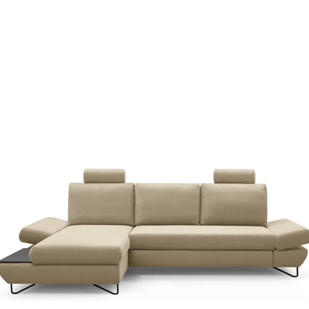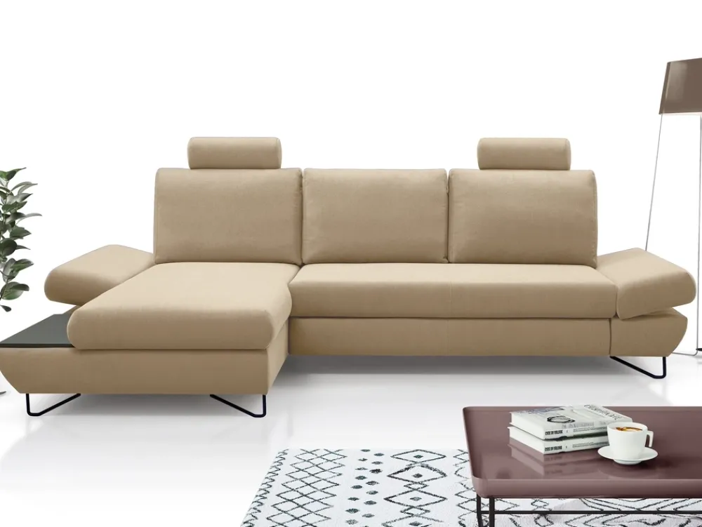 Dodatkowe kołdry i poduszki ukryjesz w głębokim pojemniku na pościel, natomiast wysokie metalowe nóżki podkreślą nowoczesny design narożnika do salonu oraz ułatwią utrzymanie pod nim czystości.