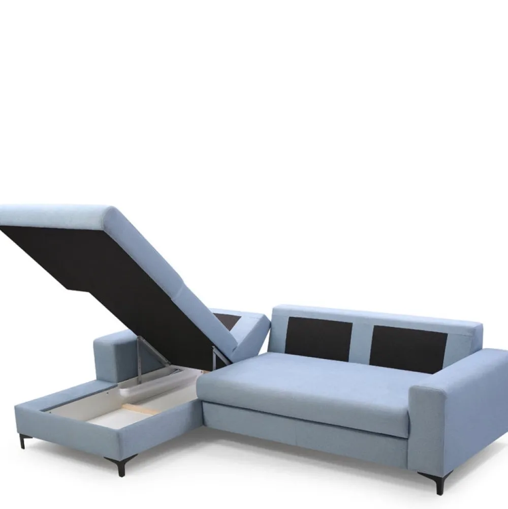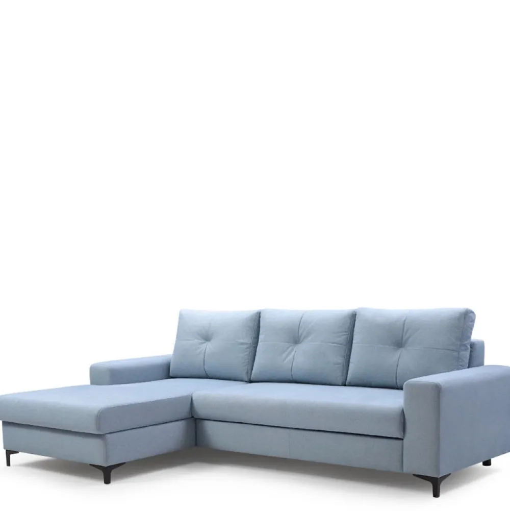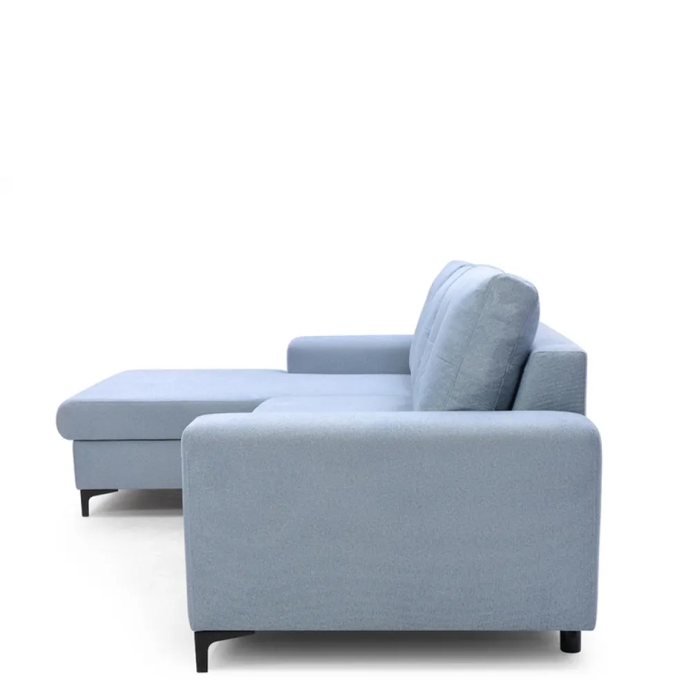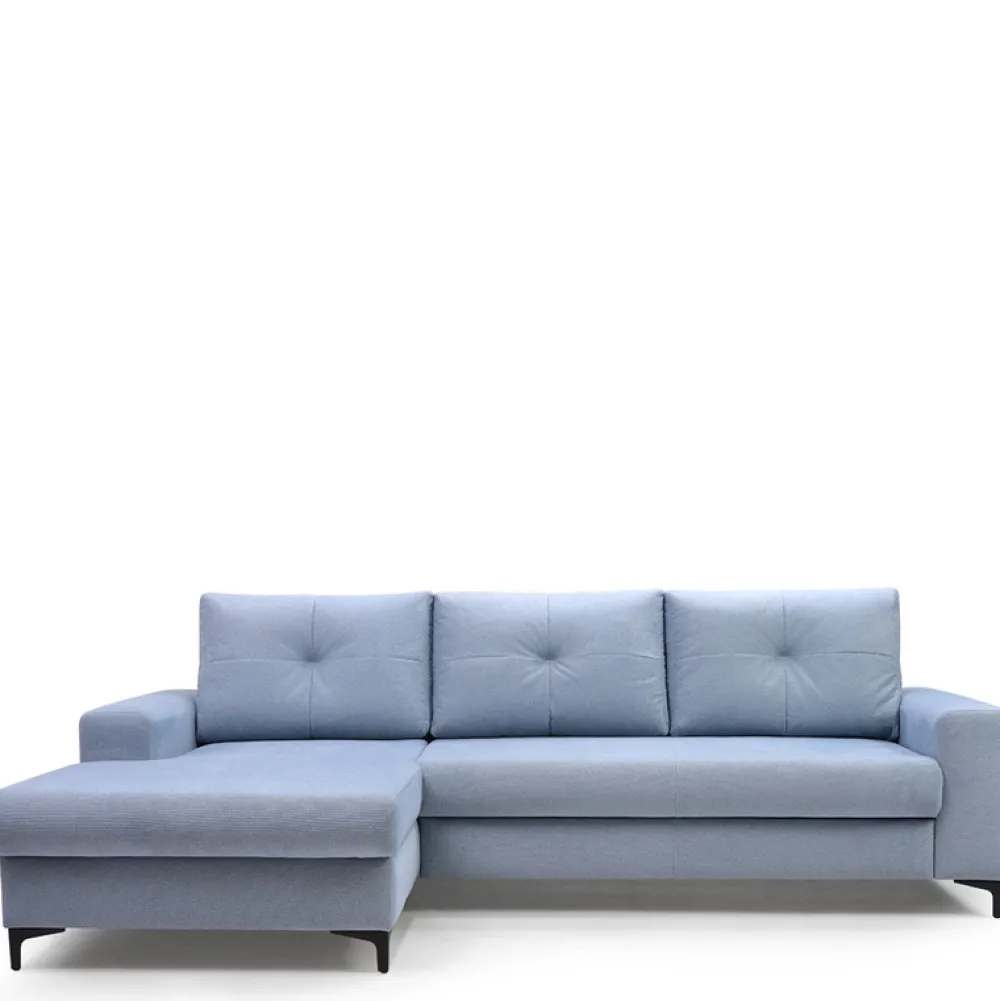 Nowoczesne rozwiązania jak metalowe czarne nóżki i ciekawe przeszycie poduch nadają mu współczesnego tonu. Narożnik jest nie tylko estetyczny, ale i funkcjonalny, wyposażony w funkcje spania o dużej powierzchni oraz pojemnik na pościel.