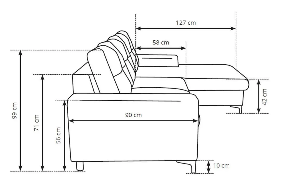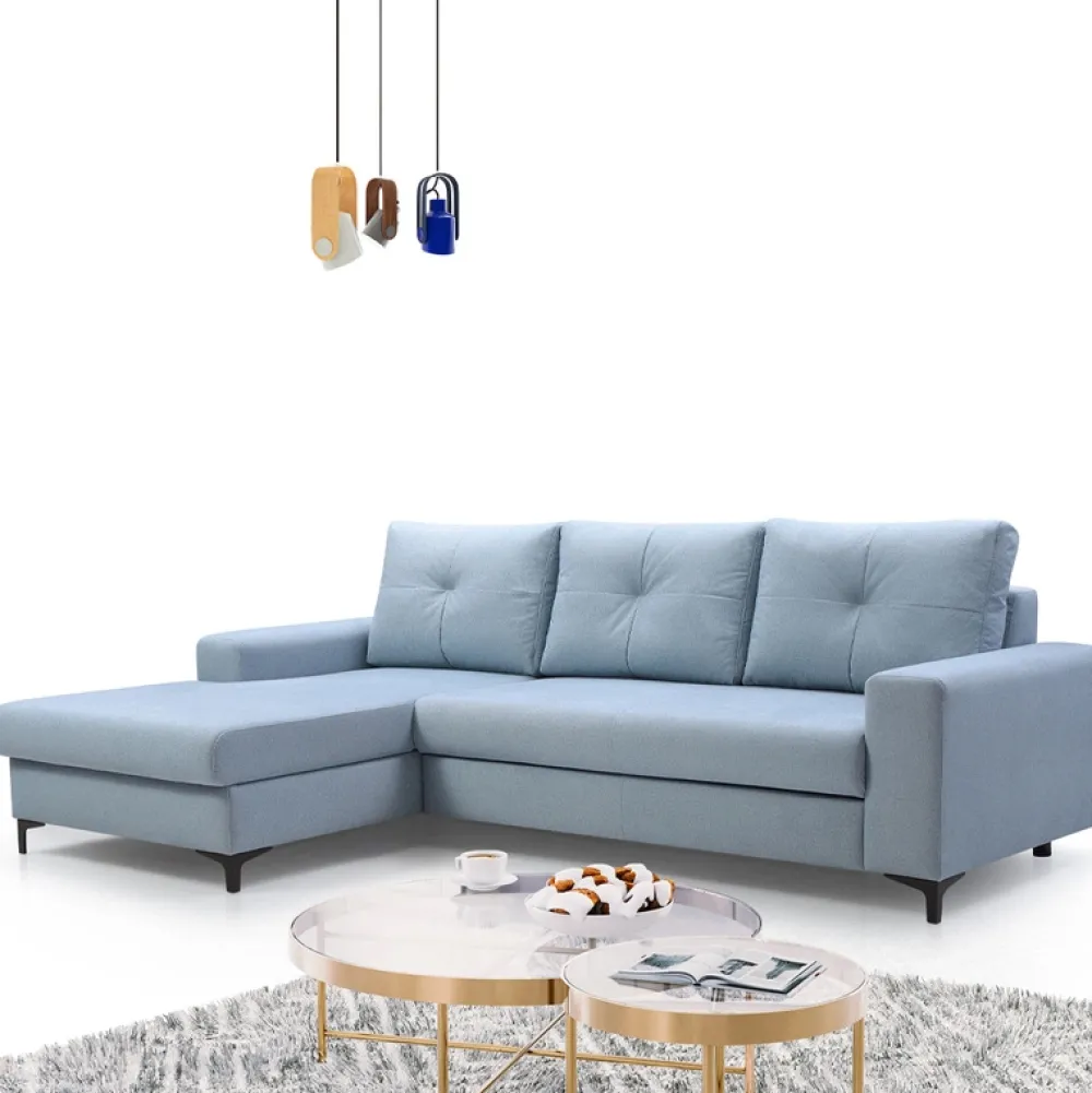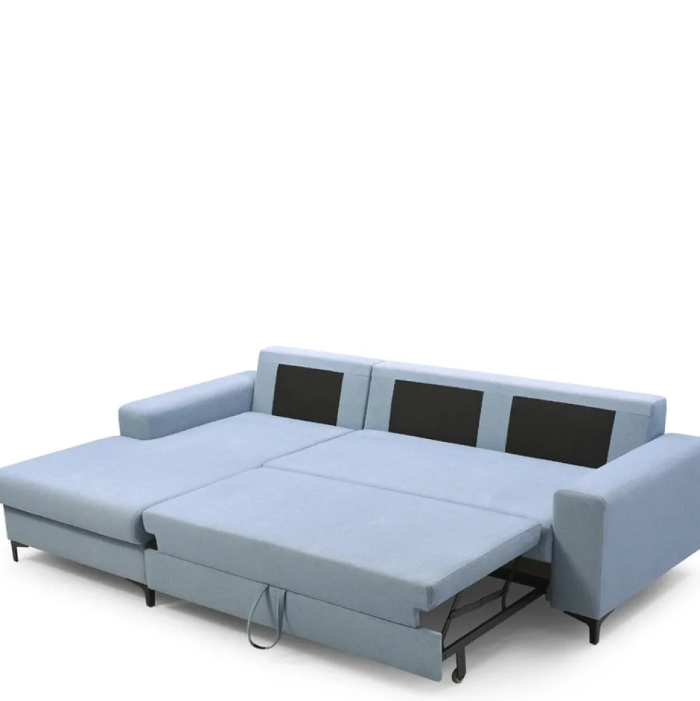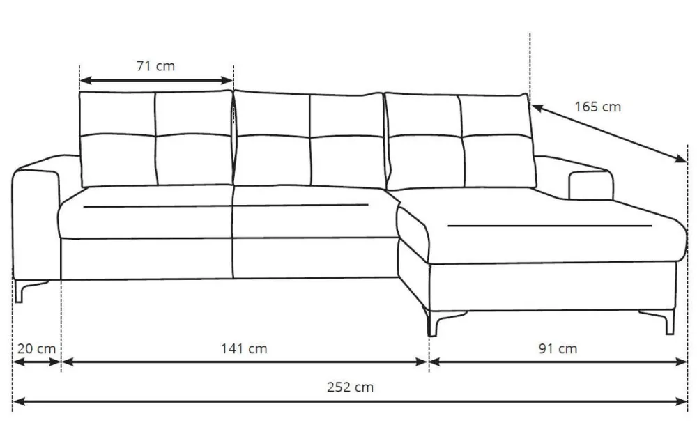 Nowoczesne rozwiązania jak metalowe czarne nóżki i ciekawe przeszycie poduch nadają mu współczesnego tonu. Narożnik jest nie tylko estetyczny, ale i funkcjonalny, wyposażony w funkcje spania o dużej powierzchni oraz pojemnik na pościel.