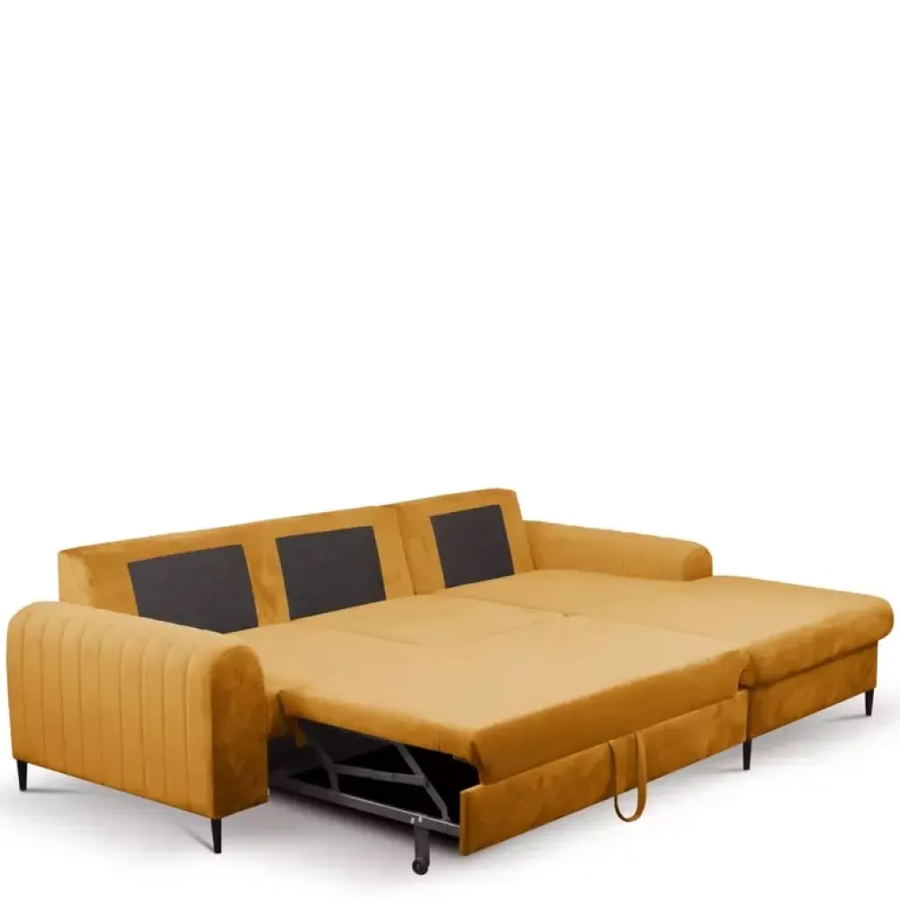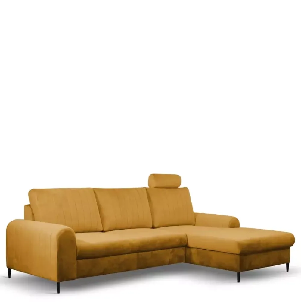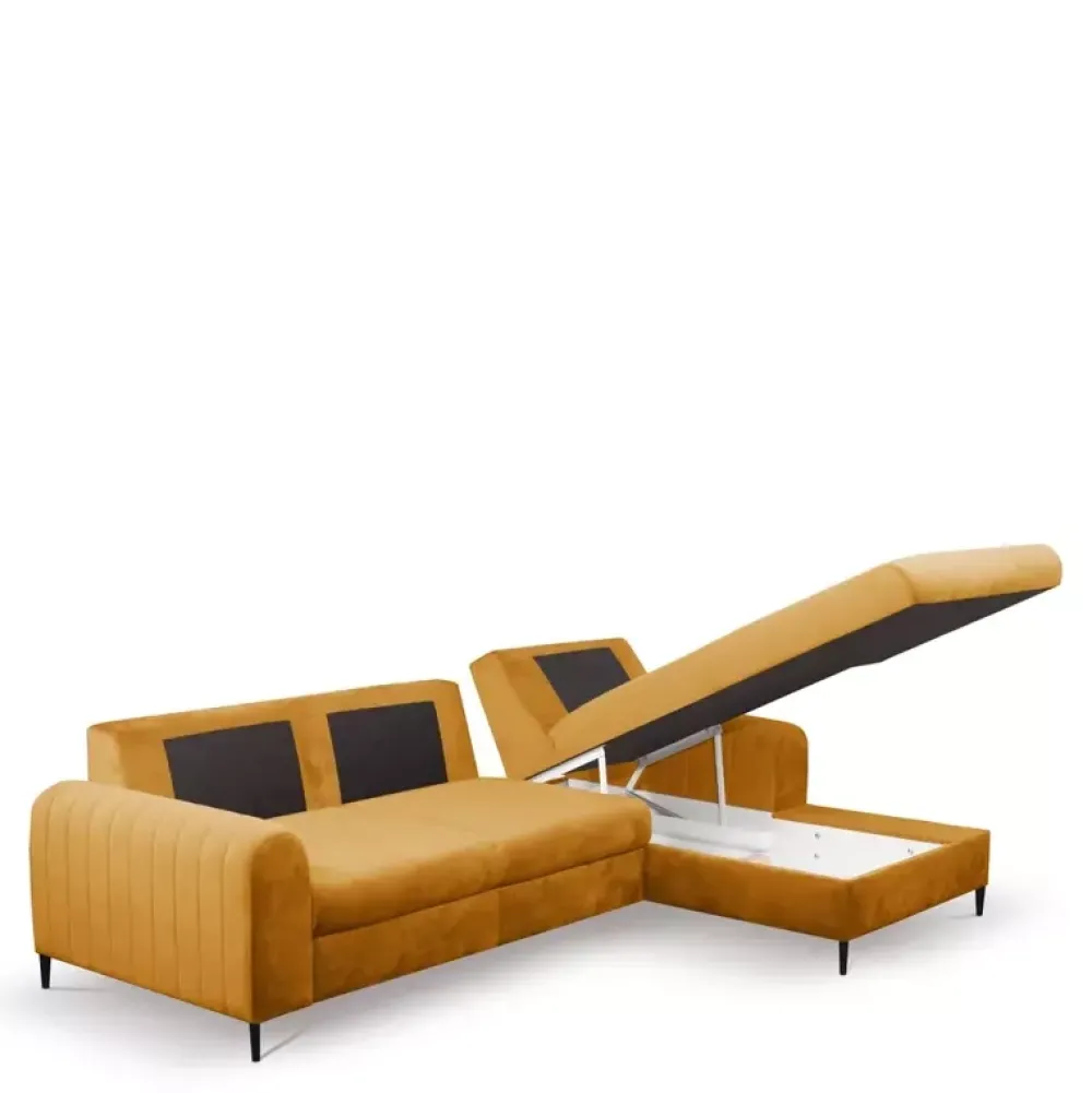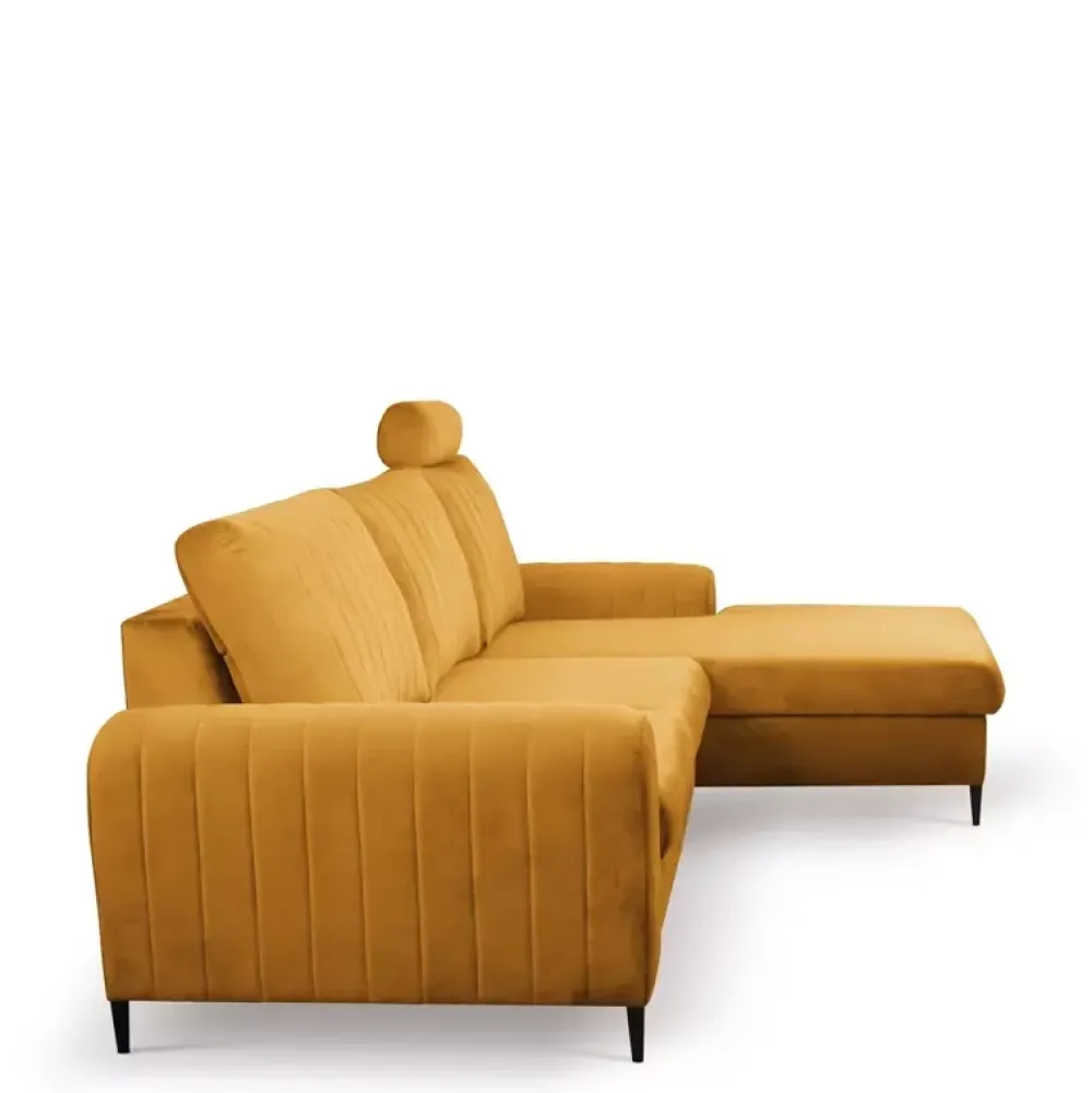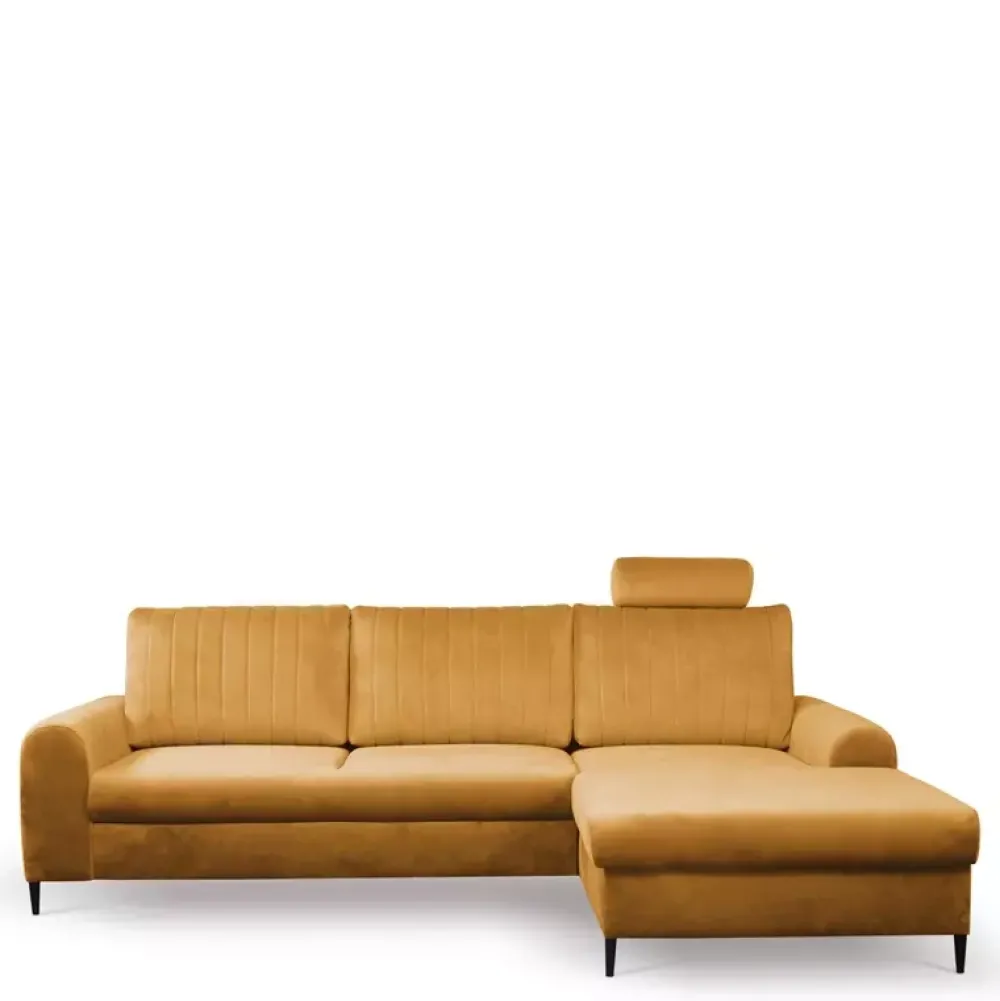 - Narożnik musztardowy z funkcją spania odnajdzie się w każdym salonie. Dobierz do niego dodatki i stwórz wnętrze, o jakim marzysz. Tkanina narożnika delikatnie połyskuje, nadając elegancki szyk.