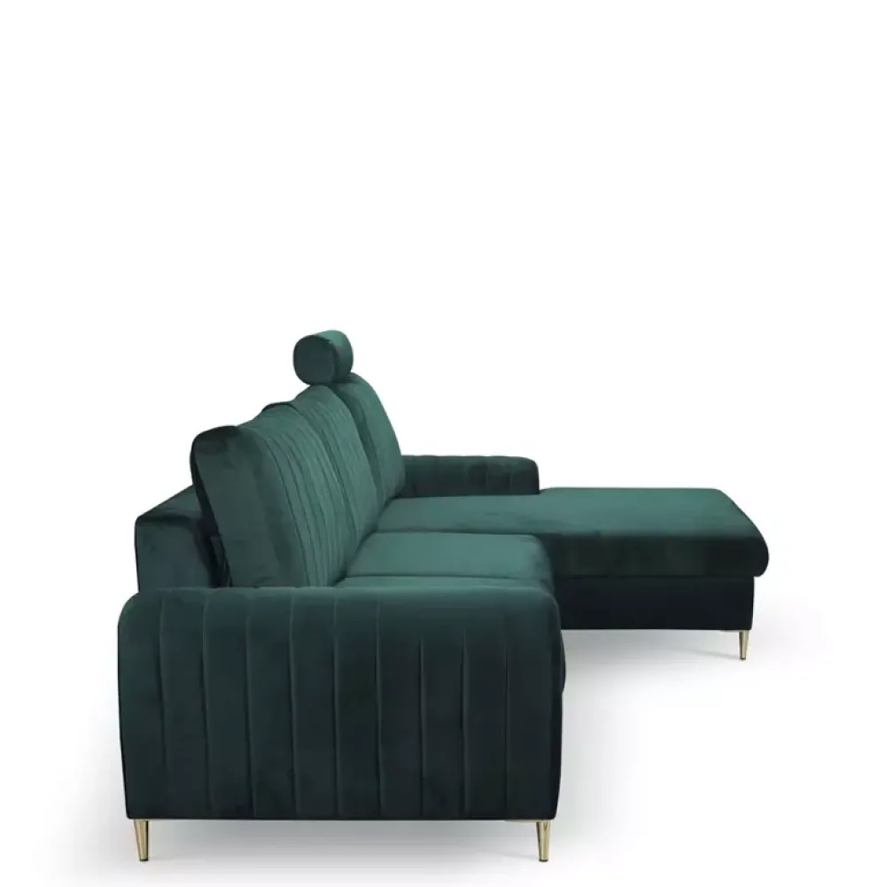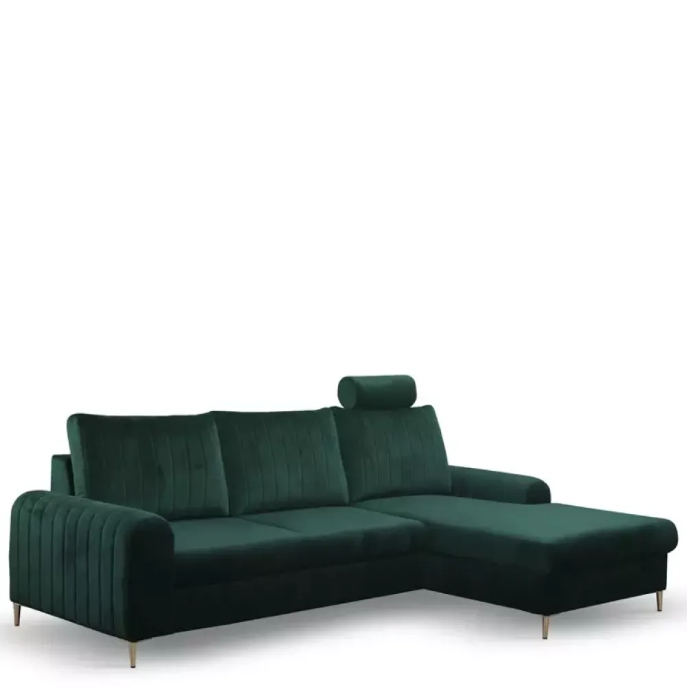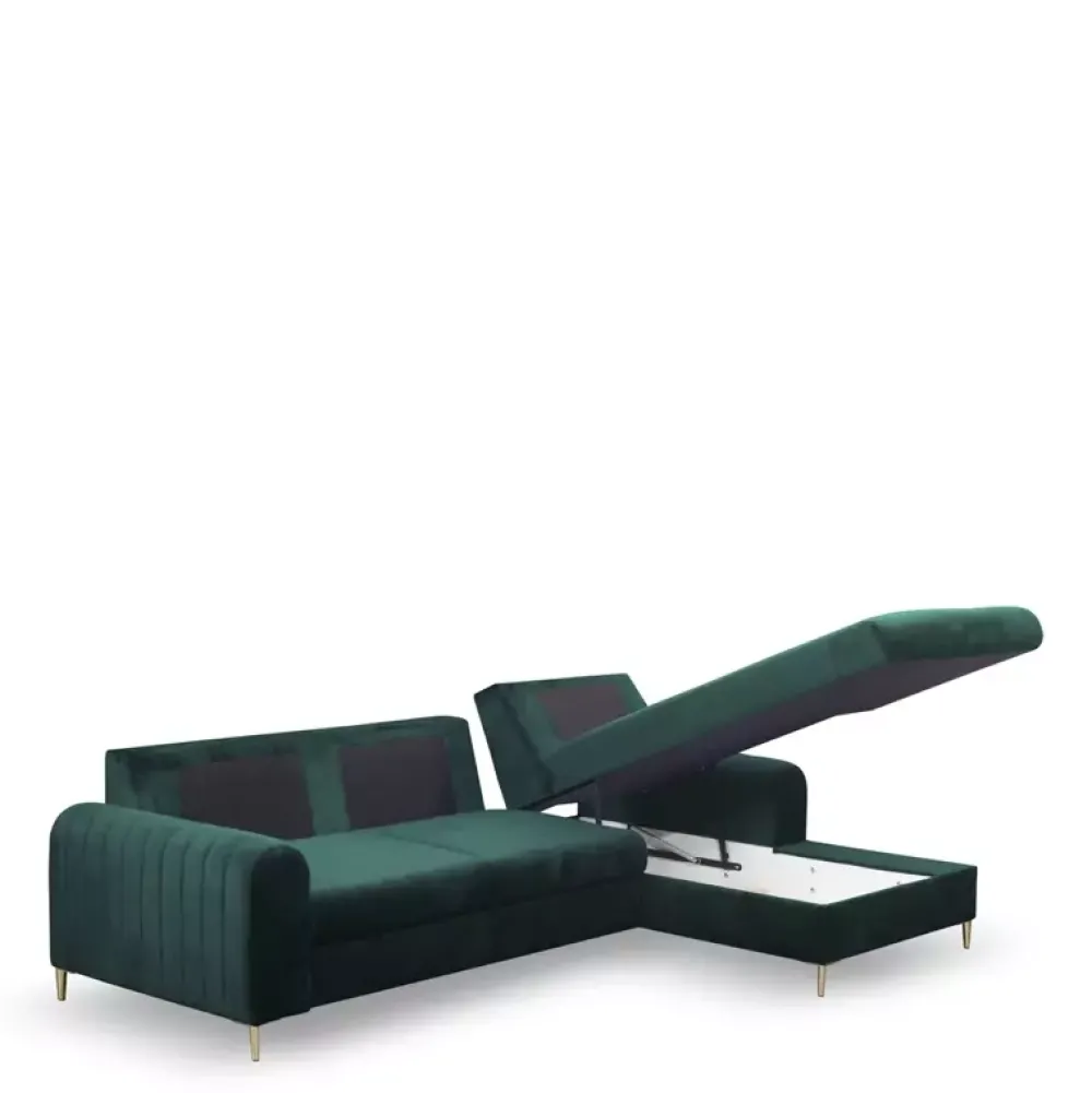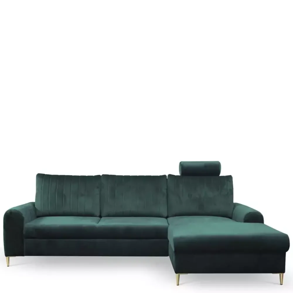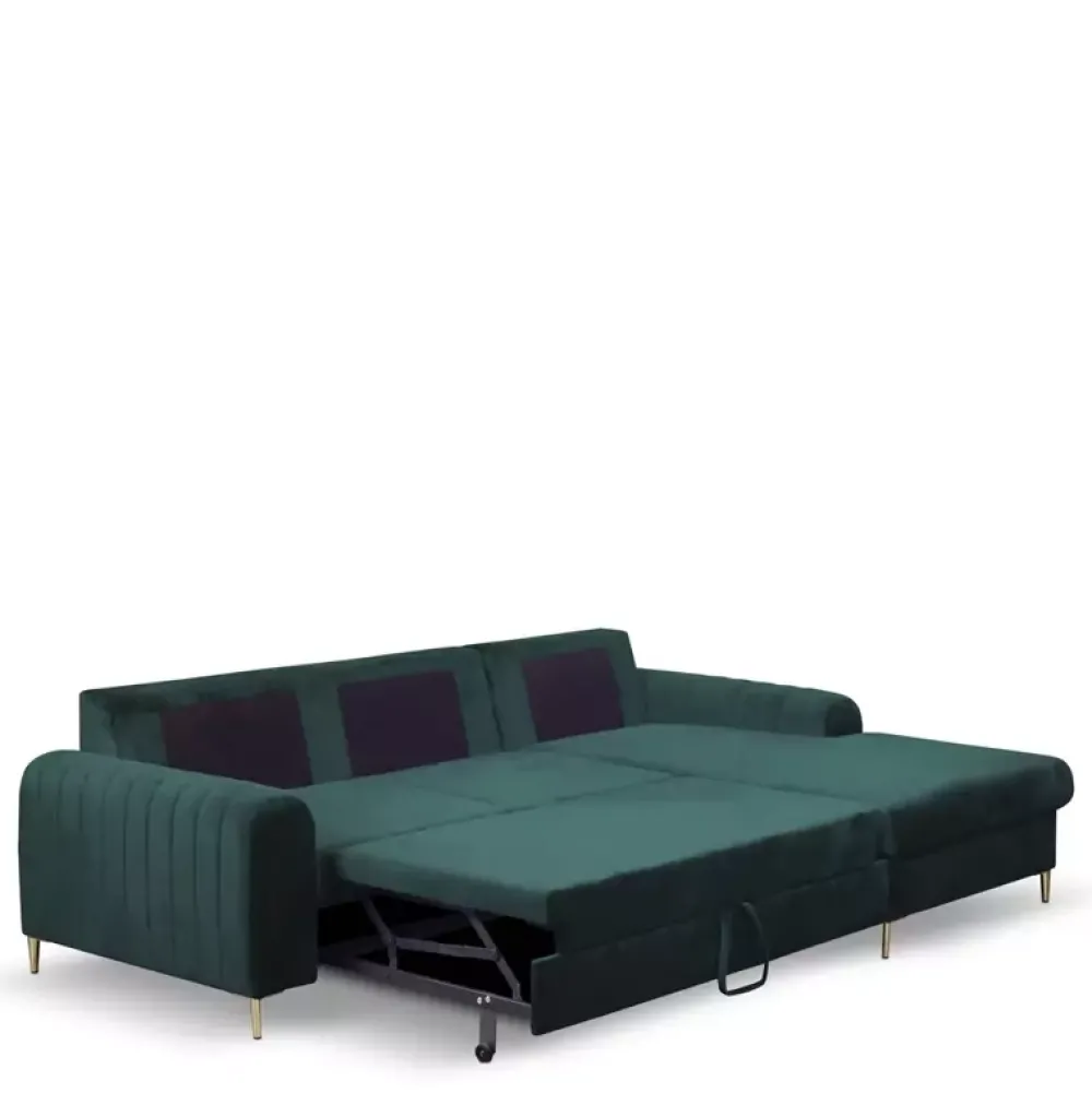 - Narożnik z funkcją spania w pięknej i przyjemnej w dotyku zielonej tkaninie. Narożnik sprawdzi się we wnętrzach w stylu glamour oraz art deco.