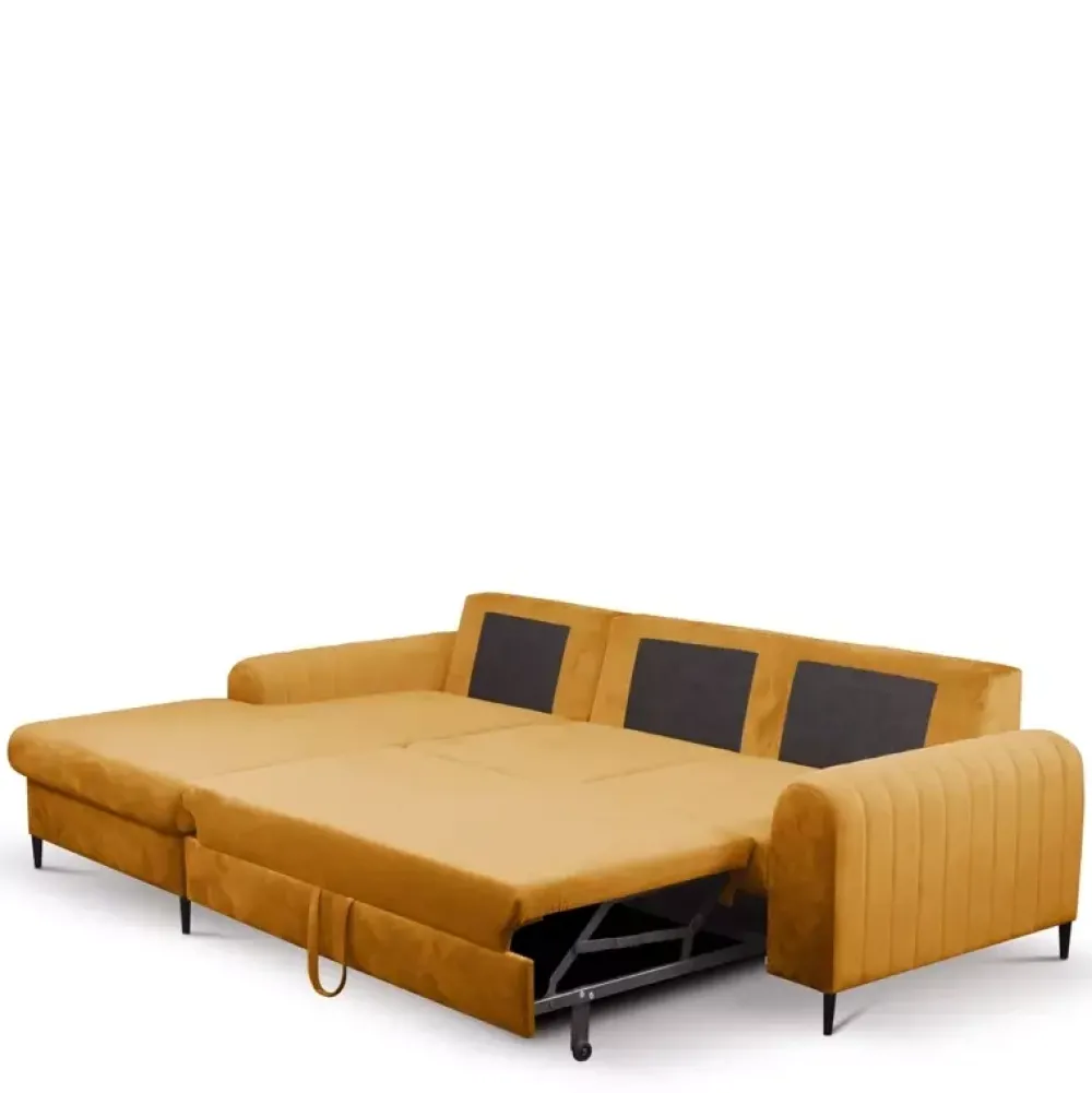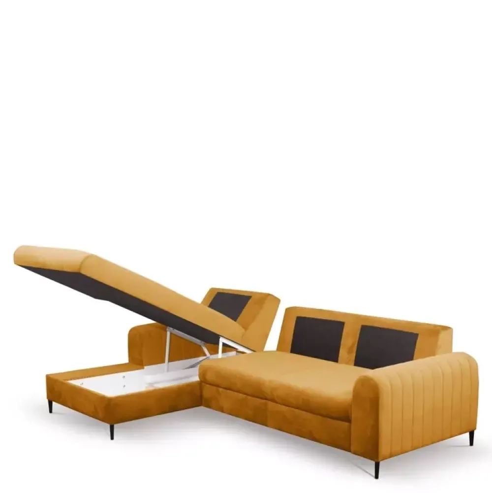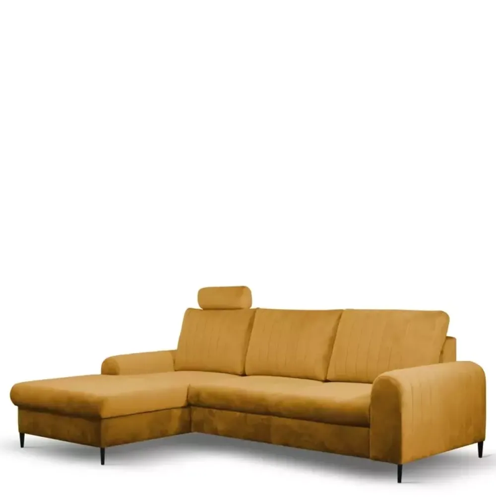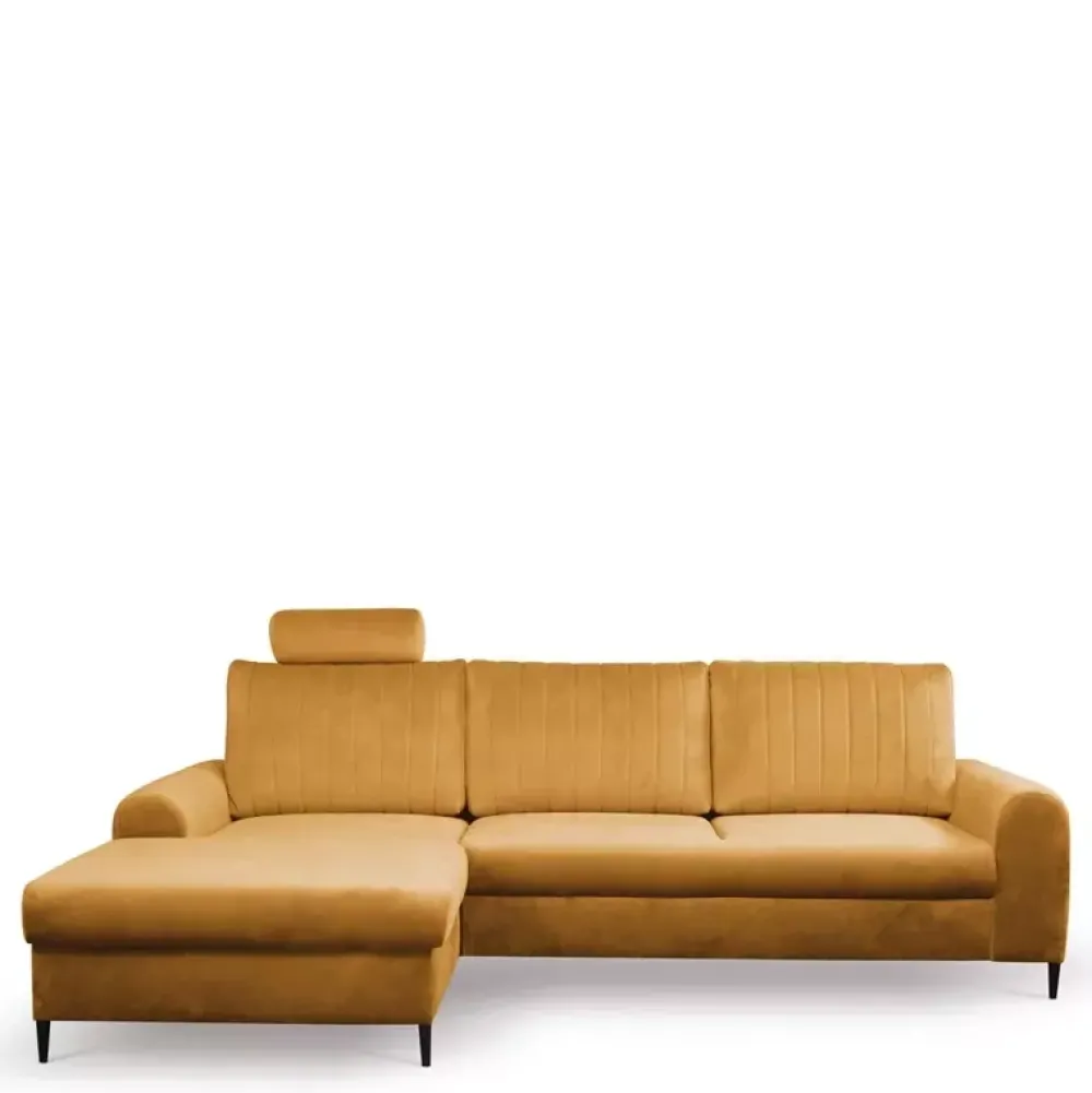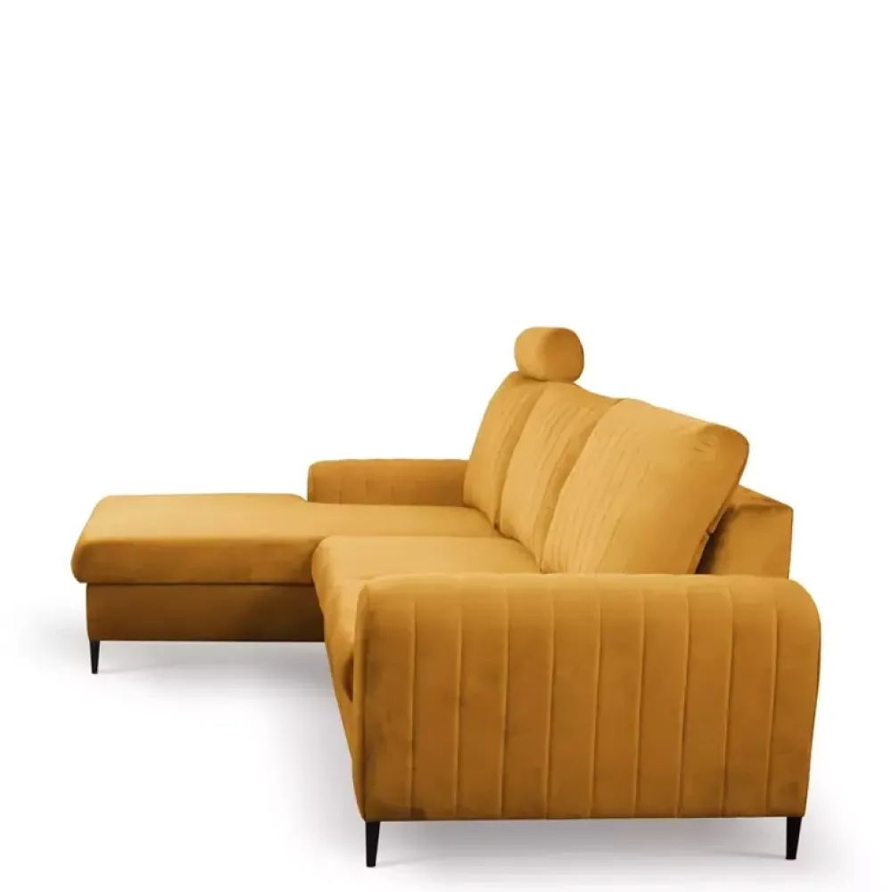 - Narożnik musztardowy z funkcją spania odnajdzie się w każdym salonie. Dobierz do niego dodatki i stwórz wnętrze, o jakim marzysz. Tkanina narożnika delikatnie połyskuje, nadając elegancki szyk.