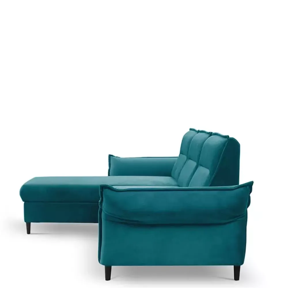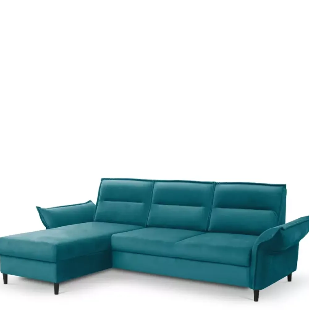 Narożnik do salonu posiada regulowane podłokietniki, które obszyto tkaniną w taki sposób, że przypominają lamówki poduch. Nadaje to meblowi luksusu. Siedzisko wypełniono wysokogatunkową piankę poliuretanową, podnoszącą komfort i wygodę.