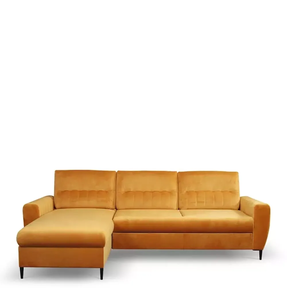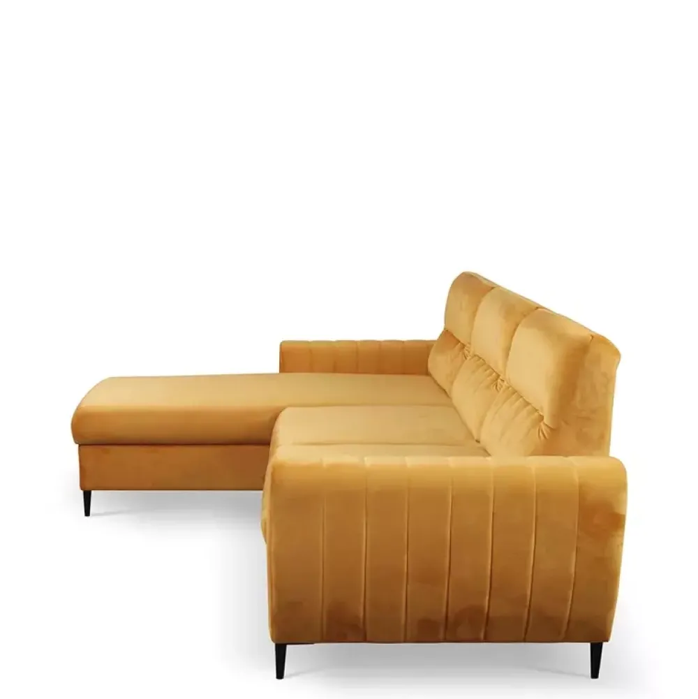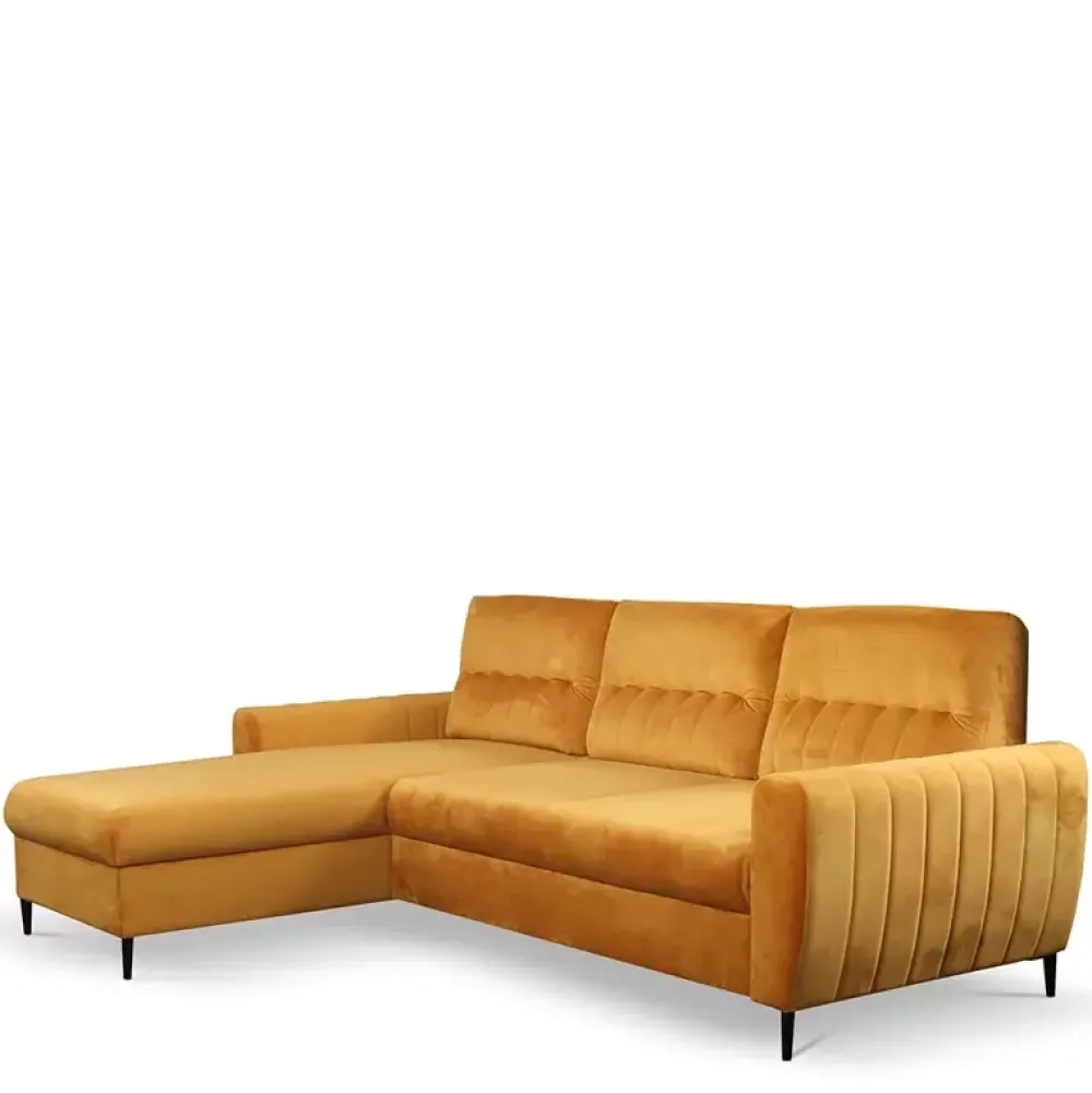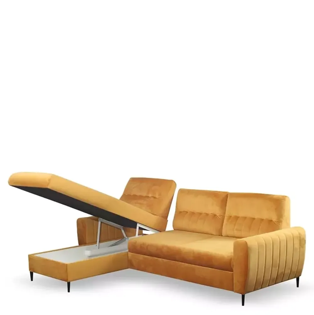 Narożnik z funkcją spania z kolekcji LIDIA posiada duży pojemnik na pościel. Jest bardzo wygodny, ponieważ w siedzisku zastosowano piankę PUR oraz sprężyny faliste, które dodatkowo pozwolą Ci cieszyć się wysokiej jakości meblem przez długie lata. Ten rozkładany narożnik został wyposażony w automat wspomagający rozkładanie, więc w kilka sekund zamienisz reprezentatywny narożnik w miejsce do spania. Wyrafinowanego szyku nadają narożnikowi metalowe stopki w kolorze czarnym. Narożnik do salonu nie musi być dużą, nudną bryłą. Może być ozdobą twojego salonu, a takiej ozdoby jak narożnik Lidia nikt się chyba nie powstydzi.