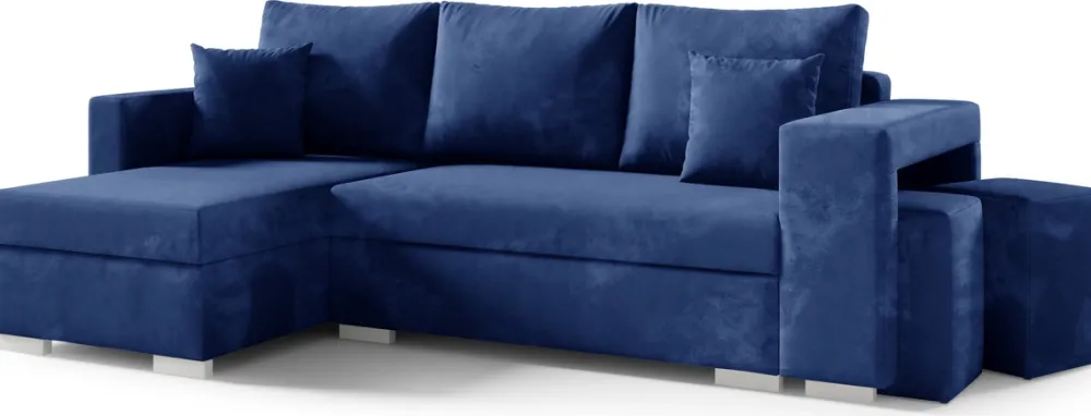 - Nowoczesny narożnik z funkcją spania o powierzchni 198 × 126 cm. Wykonany z płyty wiórowej oraz drewna sonowego, siedzisko oraz oparcie zostało natomiast wykonane na bazie sprężyn bonell, oraz pianki T-25. W zestawie pięć poduszek i dwie pufy.