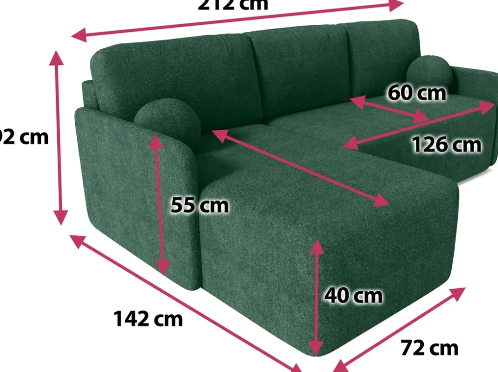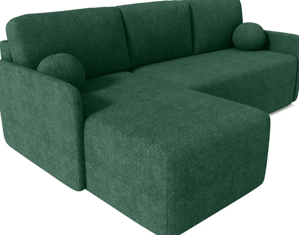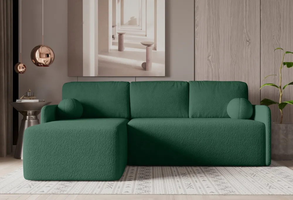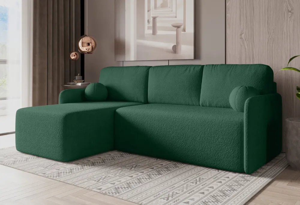 Narożnik do salonu został zaprojektowany z myślą o elastyczności — możliwość montażu prawo- lub lewostronnego pozwala na dopasowanie go do indywidualnych potrzeb i układu wnętrza. Praktyczny pojemnik na pościel, mieszczący poduszki, koce i inne akcesoria, zwiększa funkcjonalność mebla, pomagając utrzymać porządek w salonie.