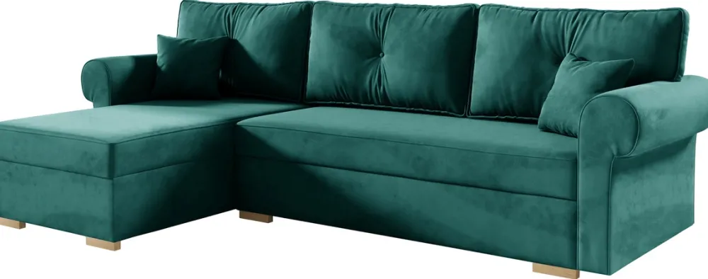 Oferujemy bogatą paletę tkanin, pozwalającą na indywidualne dopasowanie narożnika do charakteru Twojego wnętrza. Prezentowany model w odcieniu butelkowej zieleni, wykonany z tkaniny Kronos 19, która zachwyca swoim wyglądem